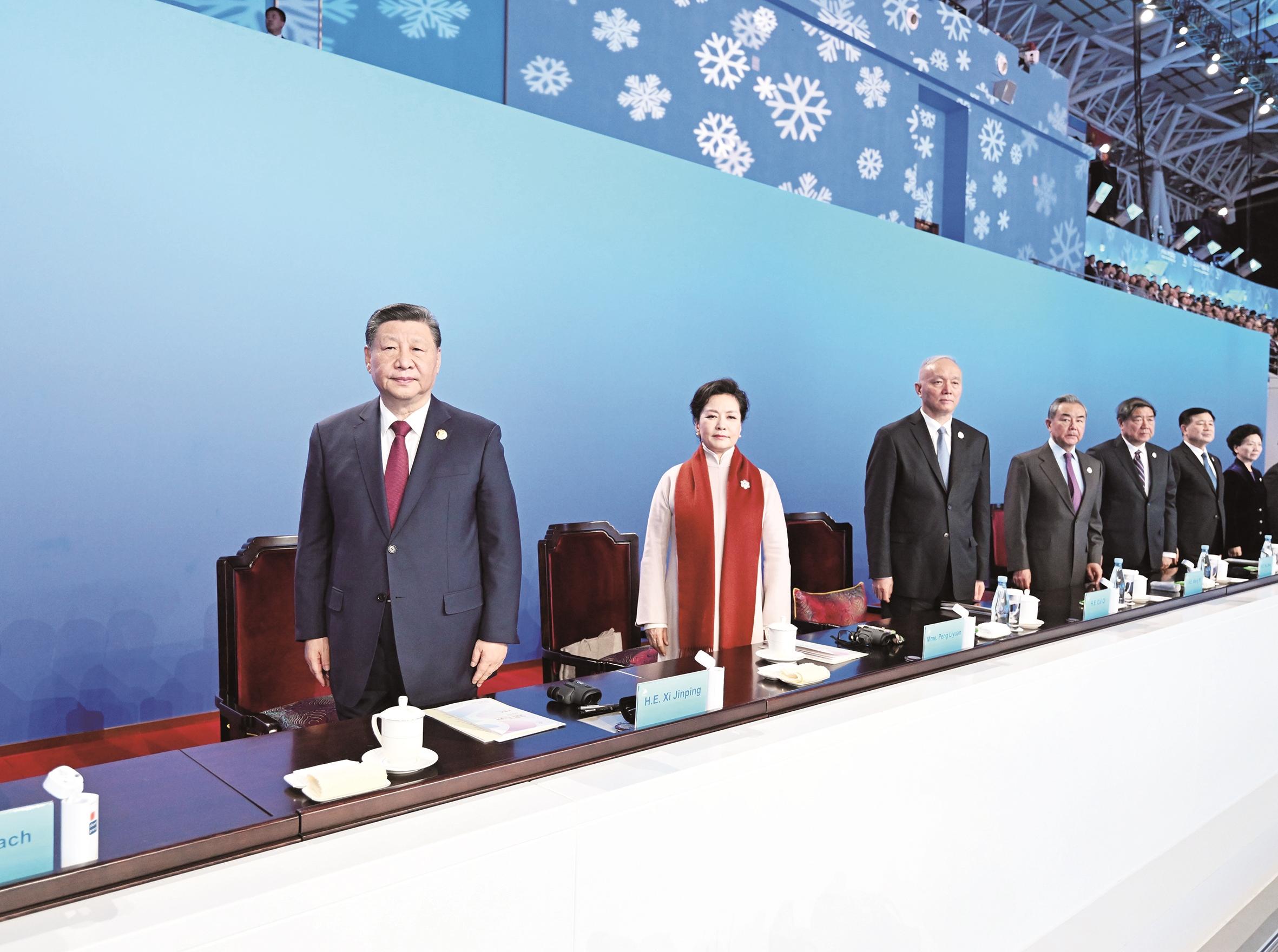 习近平发表致辞,代表中国政府和中国人民对来华出席第九届亚洲冬季运动会开幕式的国际贵宾表示热烈欢迎。下转02