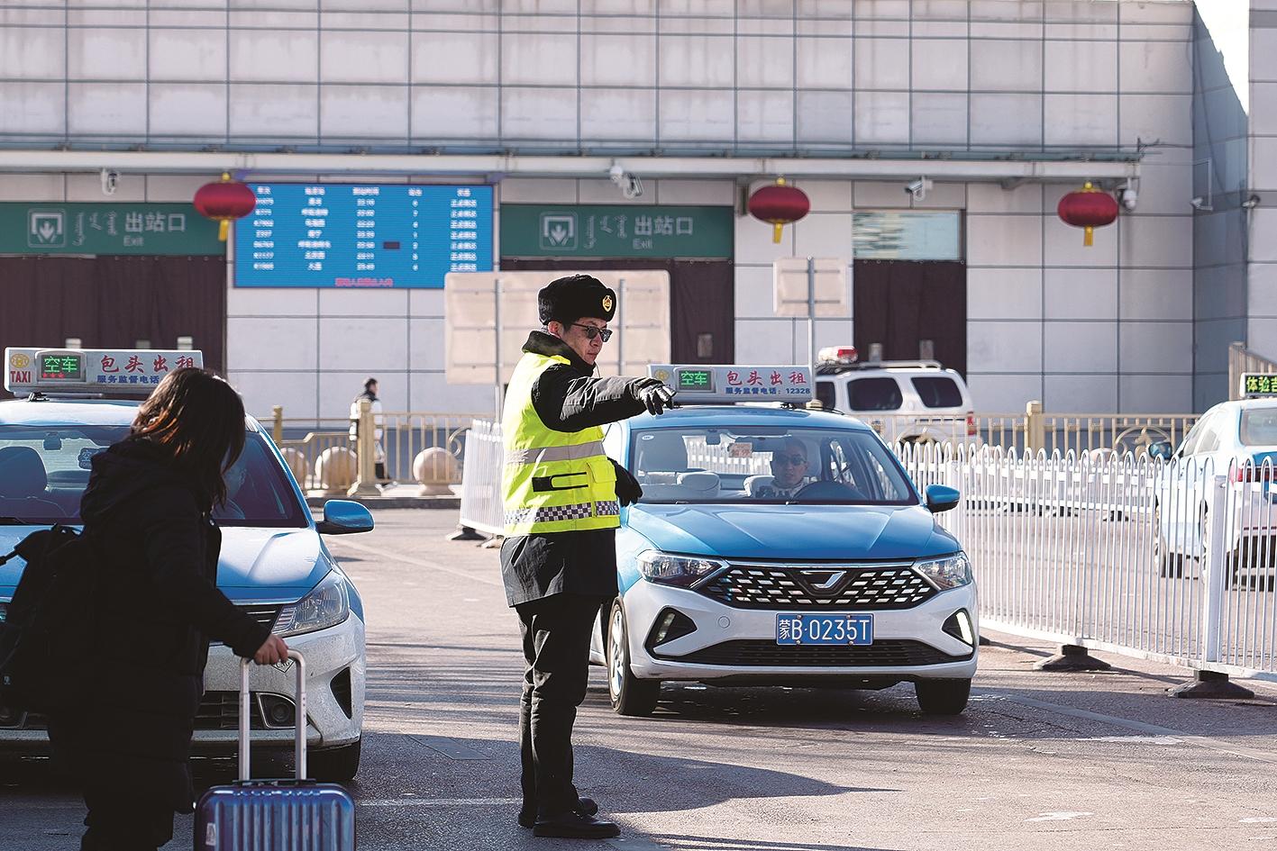 在包头火车站,交通运输综合执法支队工作人员维持车辆的运营秩序。