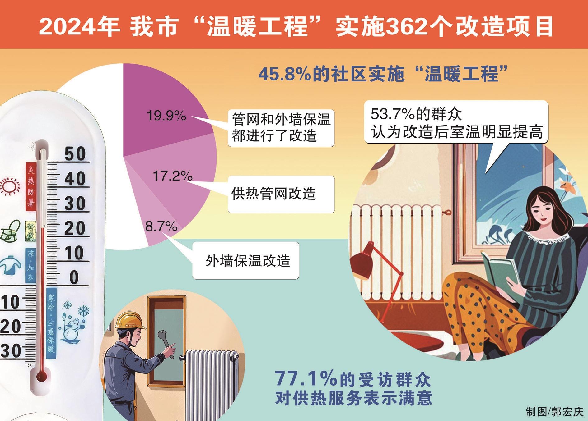 2024年,我市将“温暖工程”列入民生实事清单,全市全年累计实施362个具体改造项目,有力提升了全市供热保障的软硬件水平,为切实改善居民群众的用热条件迈出了坚实步伐。