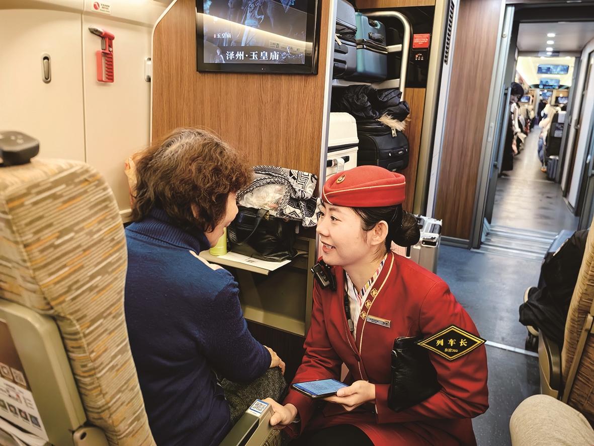 京沪高铁上,“90后”列车长韩茹在春节假期坚守岗位:面对带娃出行的父母,帮忙抱会儿孩子;看见独自出行的老人,细心询问是否需要引导……她和数万名铁路工作人员一道,为旅客提供周到服务。