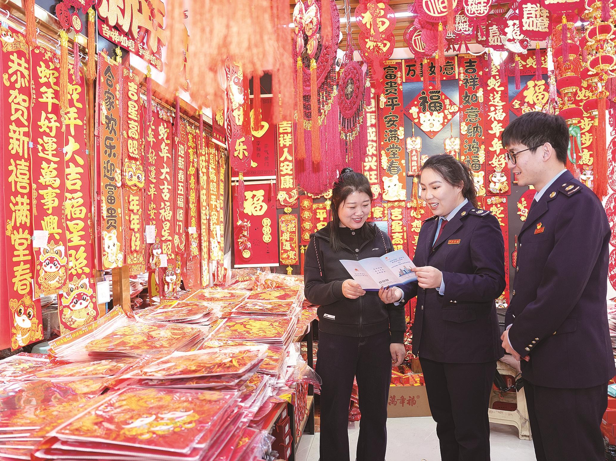 春节期间,昆都仑区税务局“昆税雷锋”志愿服务小队走进106小商品销售市场,为商户和消费者讲解最新税费优惠政策和便民服务举措。
