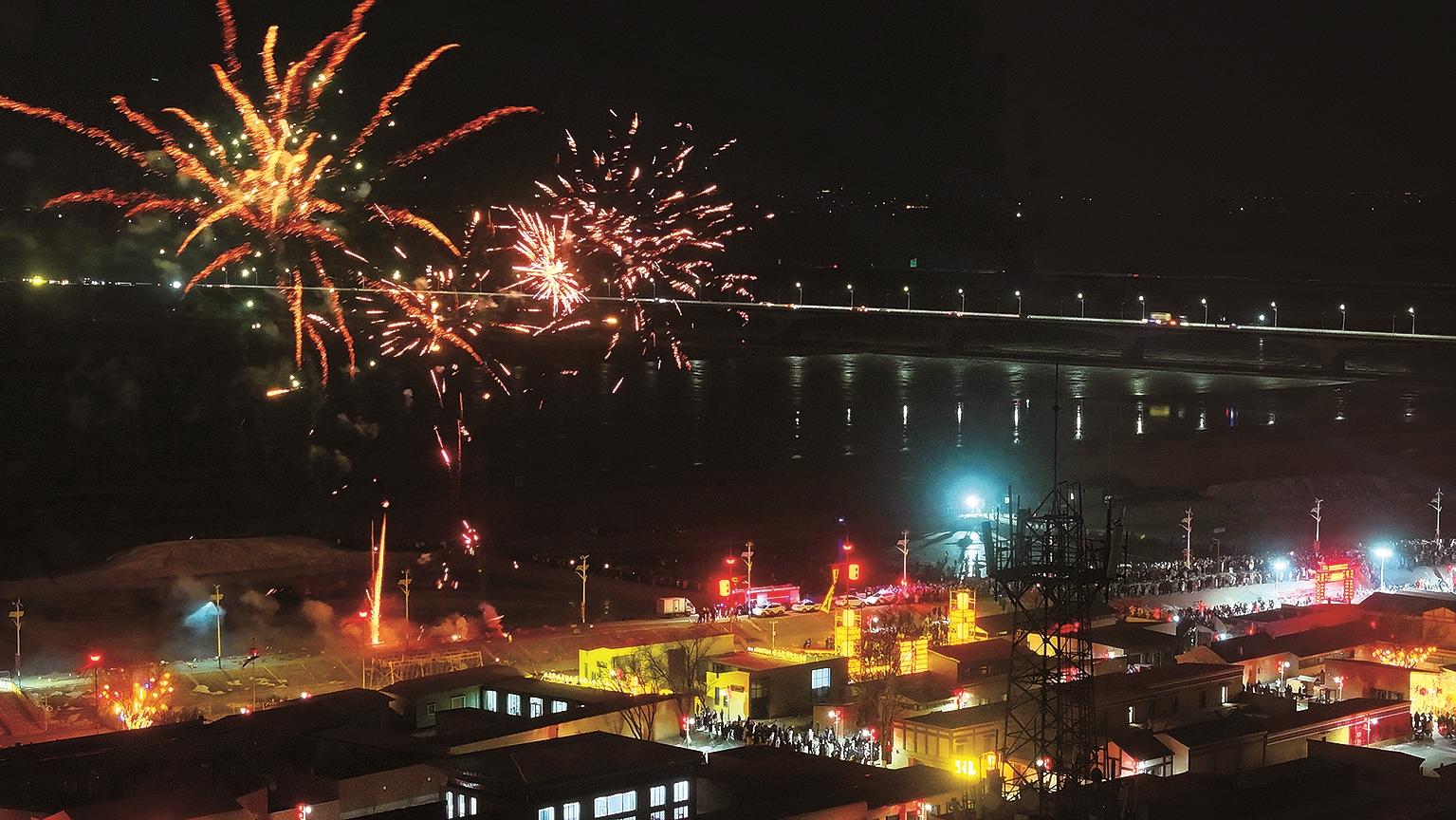 当晚最令人期待的当属盛大的烟花秀。晚上8点,烟花在夜空中绽放出各种绚丽的图案,有的像盛开的花朵,有的像闪烁的星星。五彩斑斓的烟花与黄河畔的古村落相互映衬,构成了一幅绝美的画卷。人们仰望着夜空,纷纷拿出手机记录下这美好的瞬间。