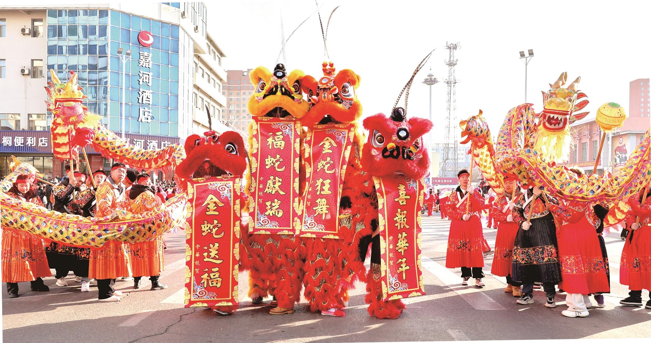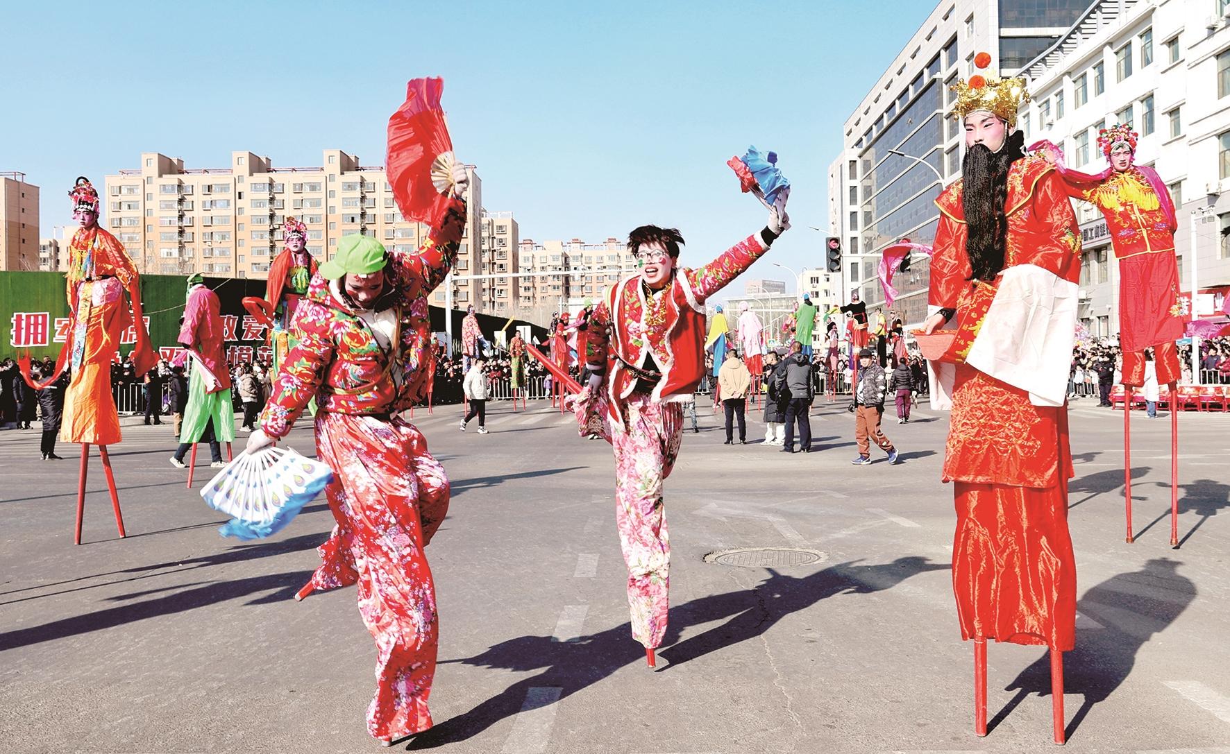 秧歌、高跷、旱船、空竹、模特方队、威风锣鼓,来自全区的民间优秀表演队伍在街头巷尾轮番上阵,各展绝技。高跷表演精彩绝伦,演员们身姿矫健,步步生风;秧歌表演百花齐放,传统伞头秧歌与东北秧歌交相辉映,充满活力;民族舞蹈夺人眼球,舞者们身着绚烂多彩的华丽服饰,灵动跳跃,生动地诠释了民族风情的绚烂多彩与团结向上的蓬勃朝气;舞龙舞狮更是将现场气氛推向高潮,每一次翻腾跳跃都让人血脉偾张。