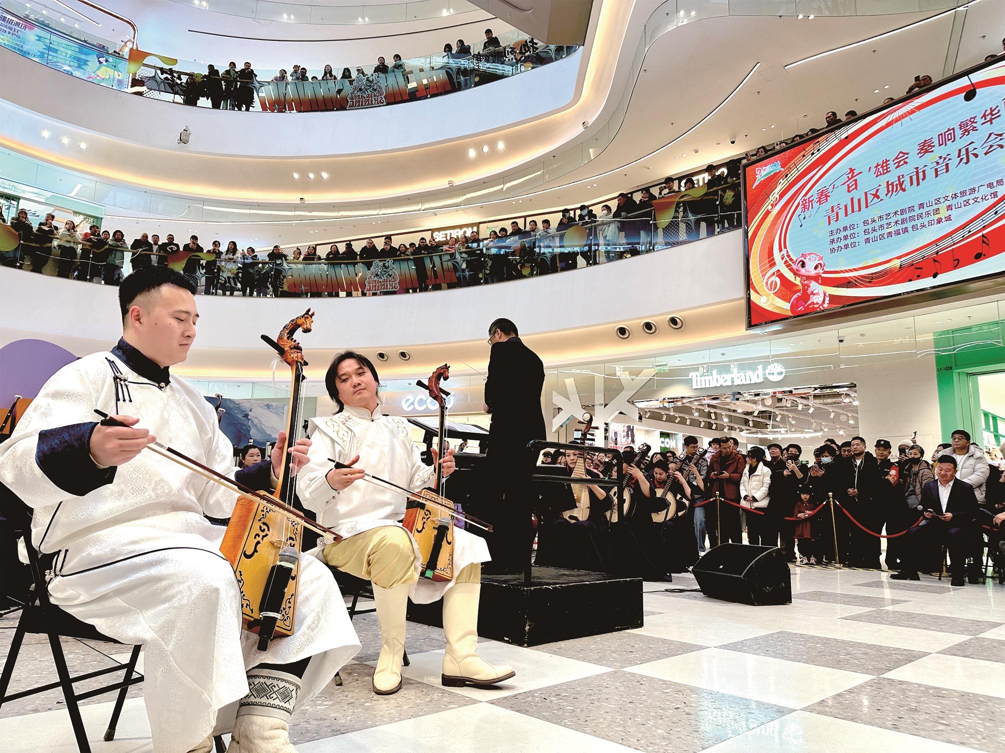高雅艺术走进商圈,奏响新春华彩乐章。正月初四至初七,包头印象城和“包棉1958”内,三场“新春‘音’雄会 奏响繁华圈”城市音乐会如期上演。交响乐专场以《春节序曲》拉开帷幕,明快的节奏、流畅的旋律瞬间点燃了现场气氛。民乐专场中,二胡、古筝、琵琶等传统乐器轮番登场,《万马奔腾》的激昂、《万丽》的欢快让观众沉醉其中。艺术家们精湛的技艺将传统与现代完美融合,为市民带来全新的文化消费体验。“没想到在商场里能欣赏到这么高水平的音乐会,真是太幸运了!”市民李女士兴奋地说。高雅艺术与商业氛围的巧妙结合,不仅拉近了艺术与百姓的距离,更探索出一条文旅商融合发展的新路径。据统计,三场音乐会共吸引观众近万人次,带动周边餐饮、零售消费显著增长。