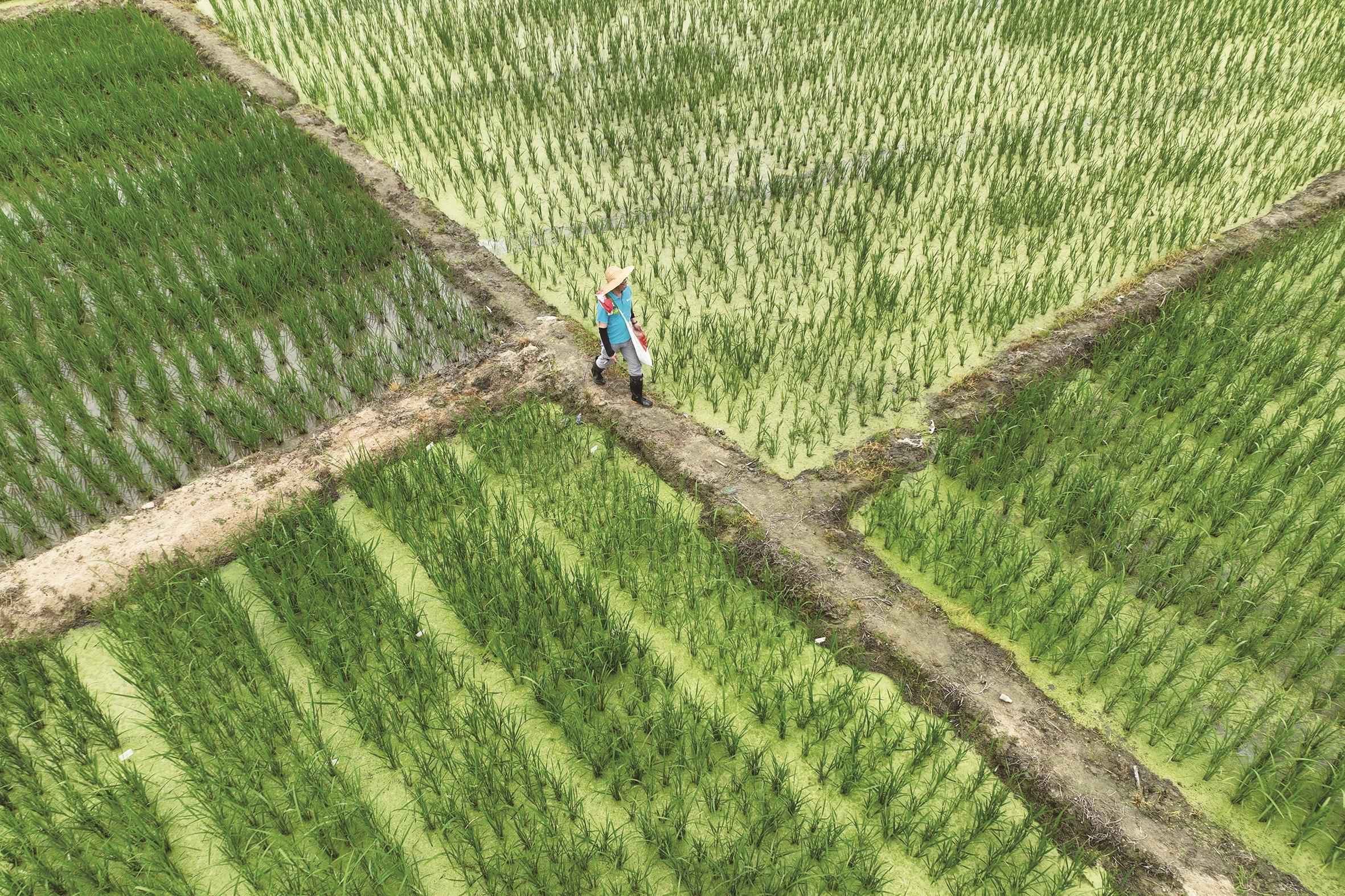 2月14日,在海南三亚的国家南繁科研育种基地里,青岛海水稻研究发展中心的科研人员张书艮对水稻进行管护(无人机照片)。