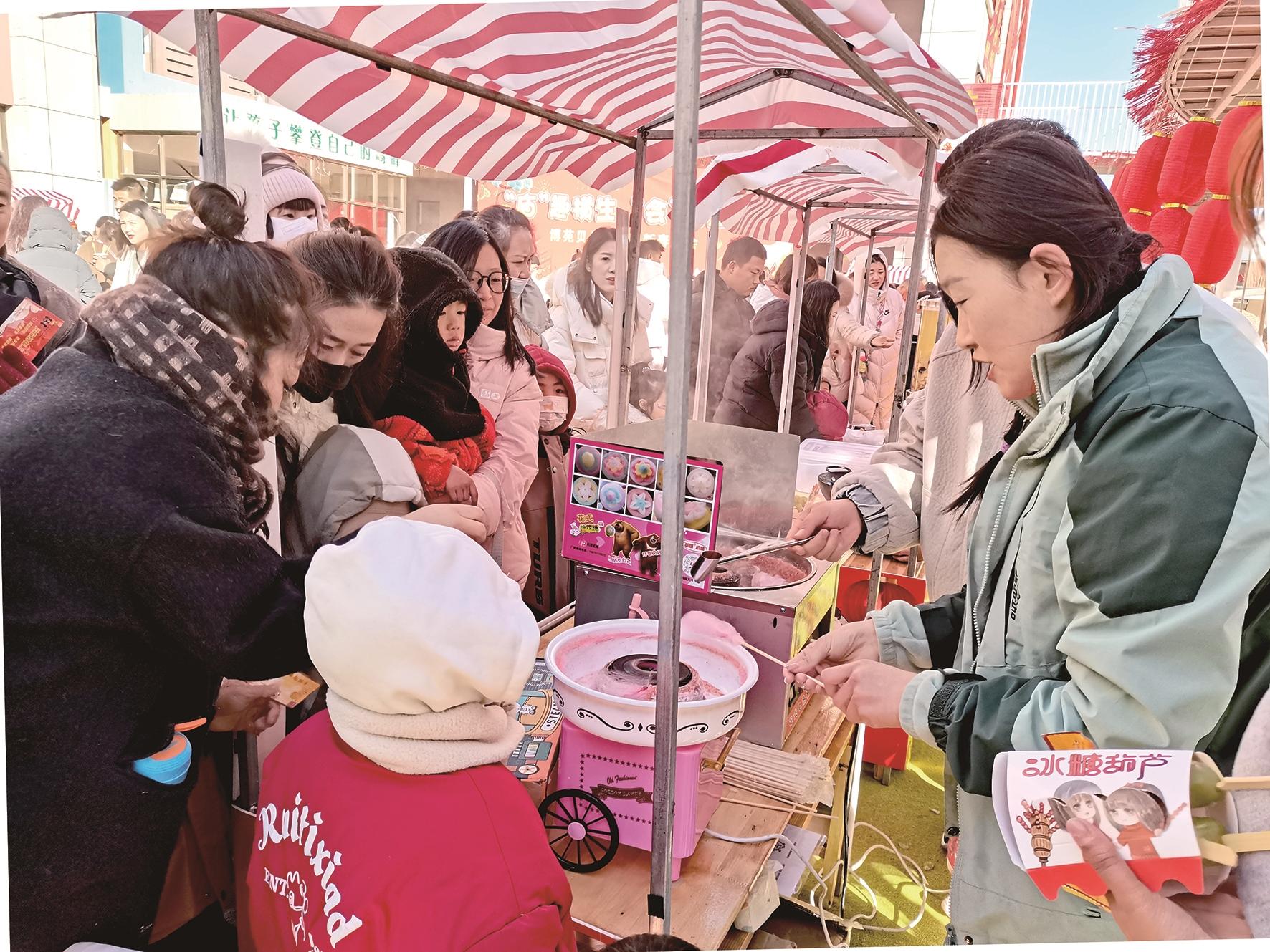 庙会的美食街区与游戏区人头攒动,糖葫芦、糖画、棉花糖等小吃供不应求。社区居民康晓敏吃着糖画笑言:“能看能吃还能玩儿,逛庙会让人感受到久违的轻松!”套圈、投壶、玩偶表演等多种互动活动令人目不暇接,欢笑声构成一幅生动的春日画卷。