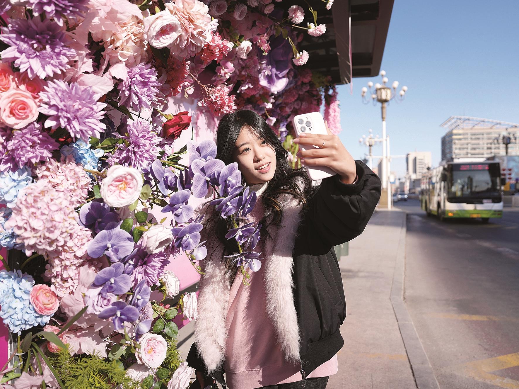 2月20日,钢铁大街王府井公交站牌处,候车亭被各式绢花装扮一新,许多市民和路人在此拍照打卡,感受春天里这份特别的浪漫。 记者 李强 摄