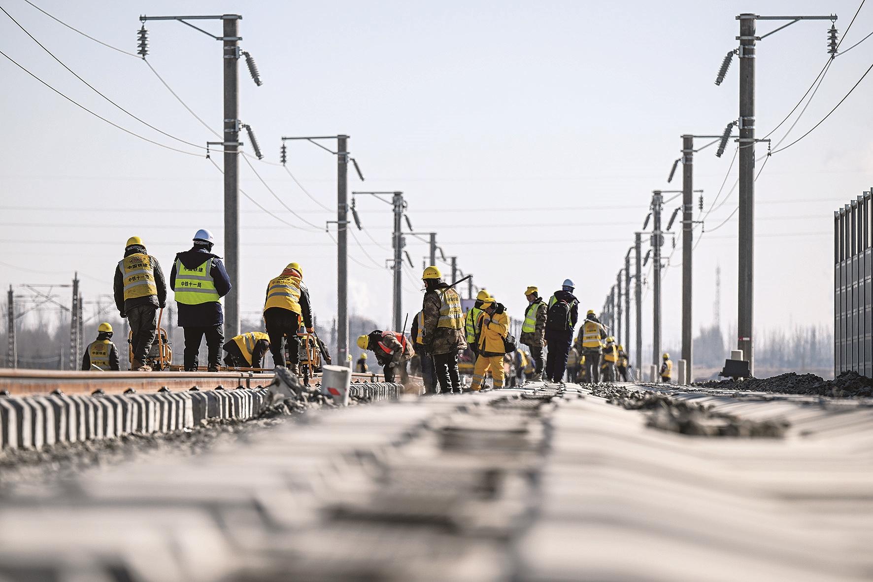 2月22日,施工人员在包银高铁内蒙古包头至临河区段进行铺轨作业。
