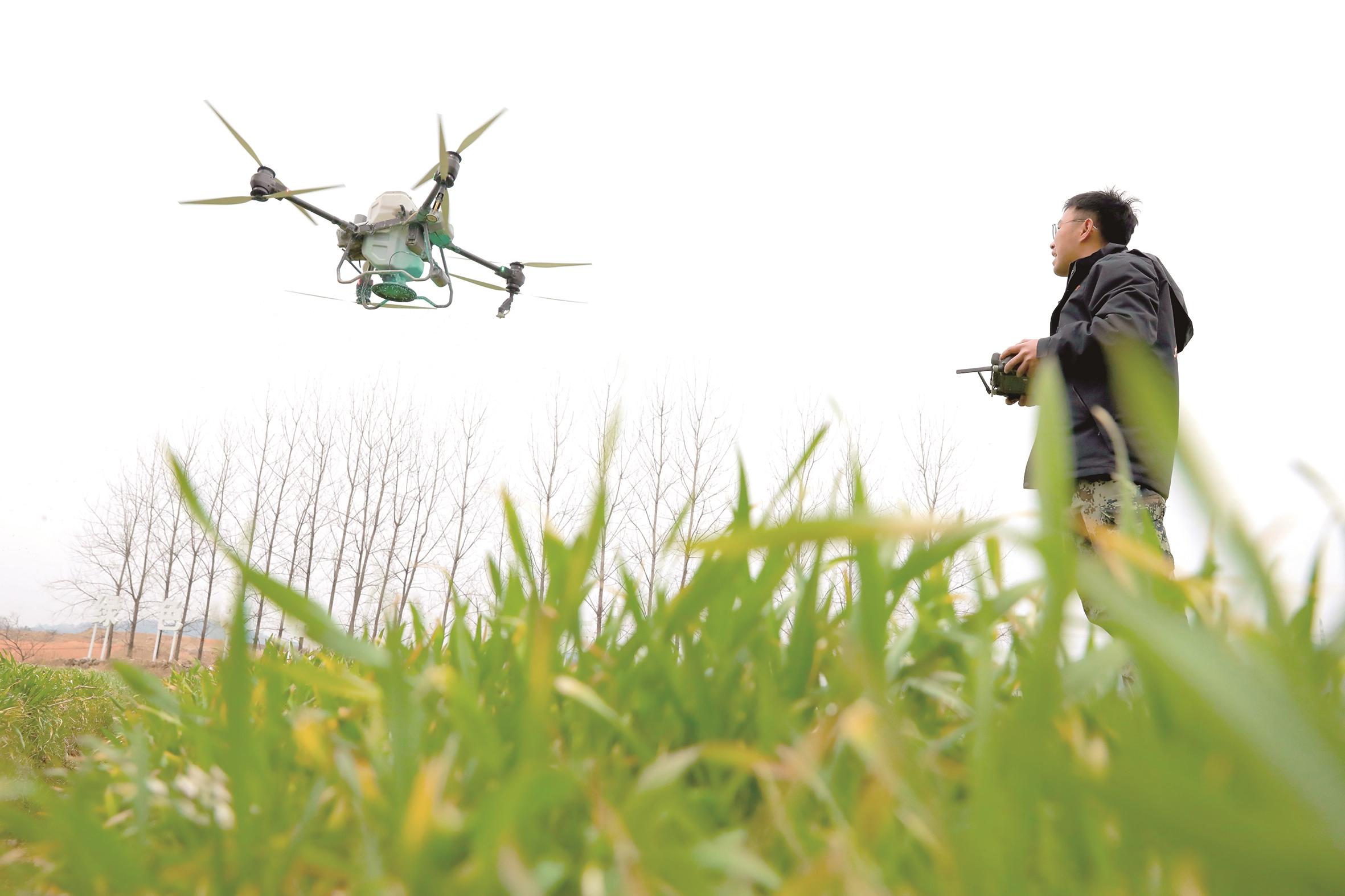 2月14日,在浙江省杭州市临安区天目山镇“天目粮仓”粮食功能区,农机人员遥控植保无人机给小麦施肥。新华社发 胡剑欢 摄