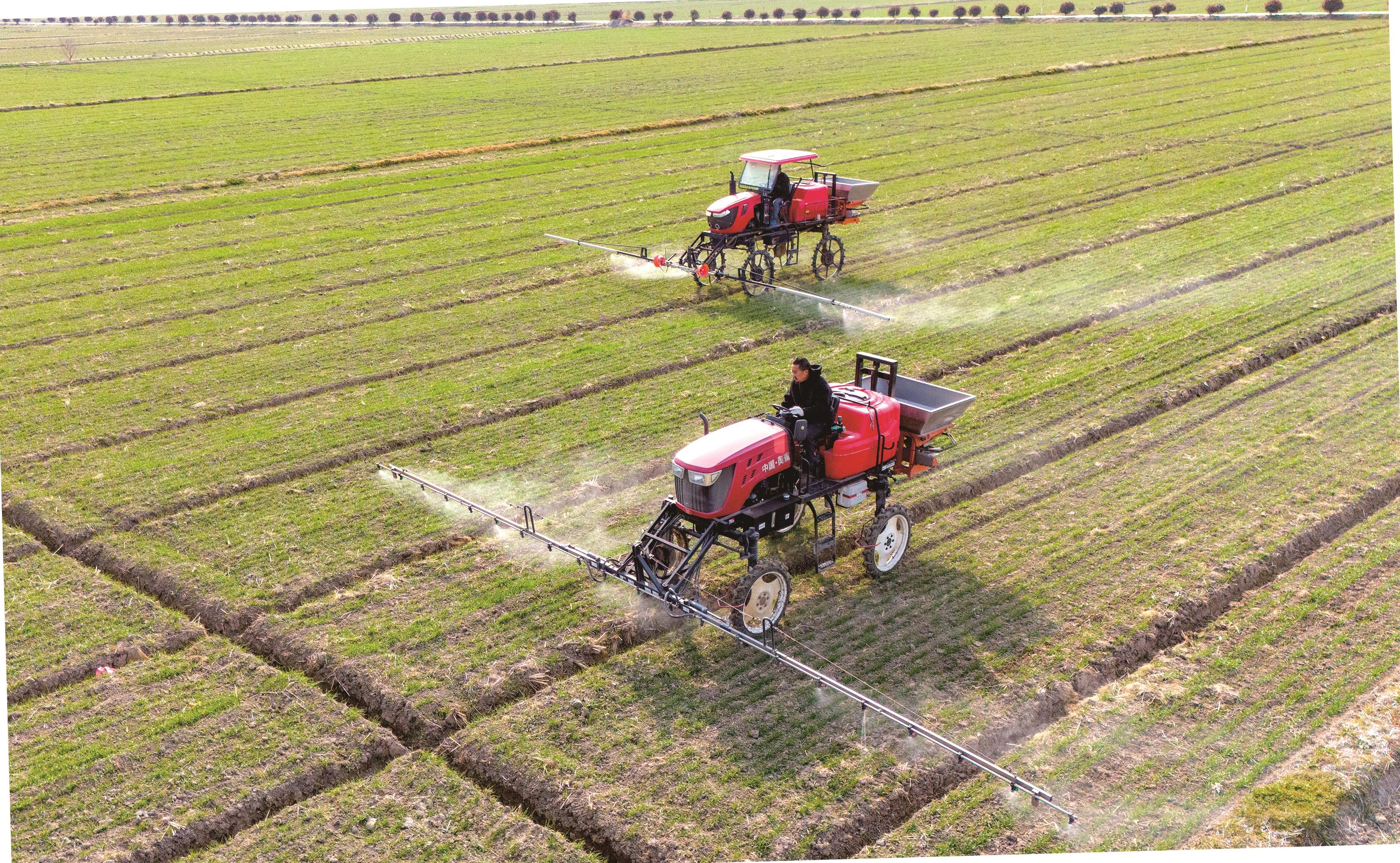 2025年2月20日,在江苏省南通市通州区十总镇育民村高标准农田,农民驾驶植保机械对进入返青期的小麦开展病虫害防治作业。