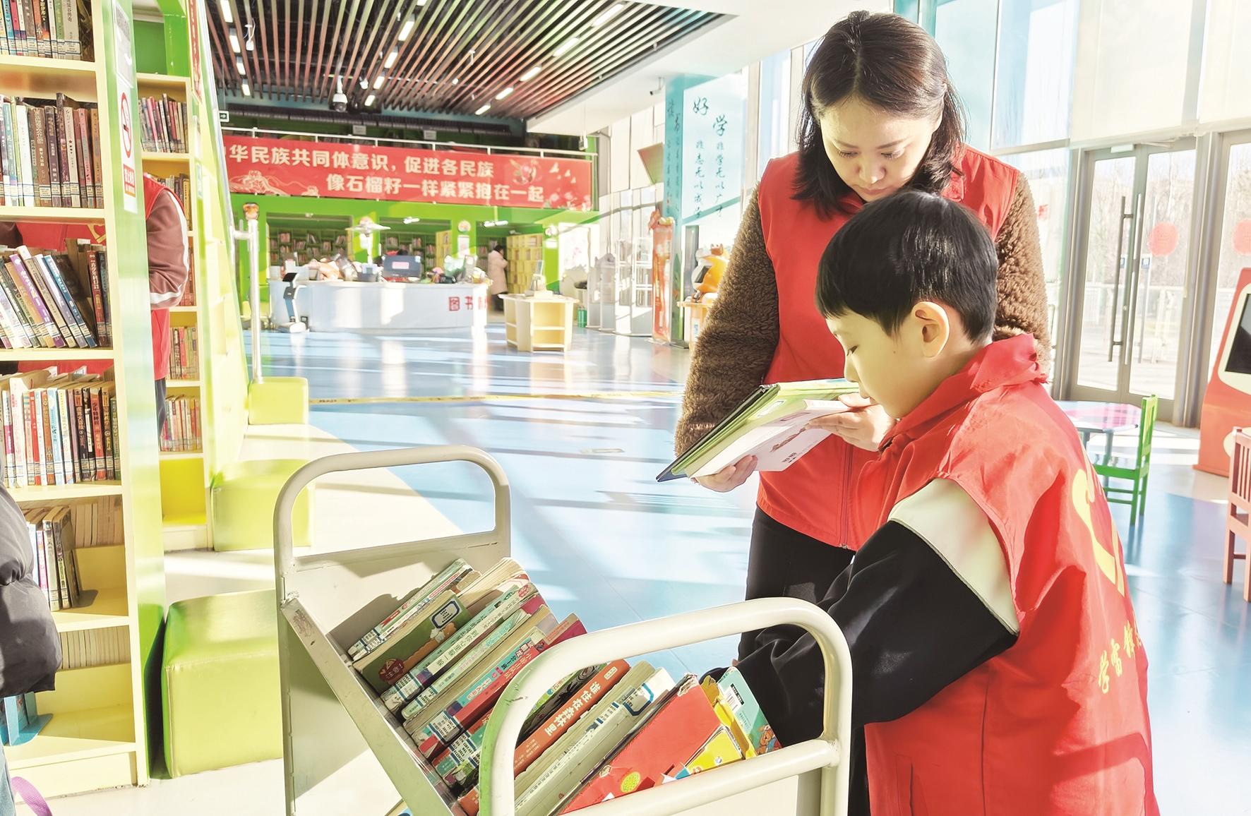 本报讯 近日,包头市图书馆少儿分馆为全市少年儿童及家长搭建连接家庭、学校和社会三位一体的阅读实践平台,举办了“书香相伴,亲子同行”亲子志愿服务再接力活动,传播与书为伴、助人为乐的志愿服务精神。60余组家庭踊跃参与。馆员老师热情地迎接亲子志愿者们,并为大家详细介绍了少儿分馆各功能区域的划分、丰富的馆藏资源以及自助借还机使用方法。随后,家长和孩子们迅速进入角色,默契配合,有的负责整理书架,将散落的书籍归位;有的在修补破损图书;有的在借阅区为读者提供引导,耐心解答疑问。此次亲子志愿服务活动让孩子们在实践中收获成长,也为亲子间的交流与互动搭建了平台,进一步营造全民阅读的良好氛围。