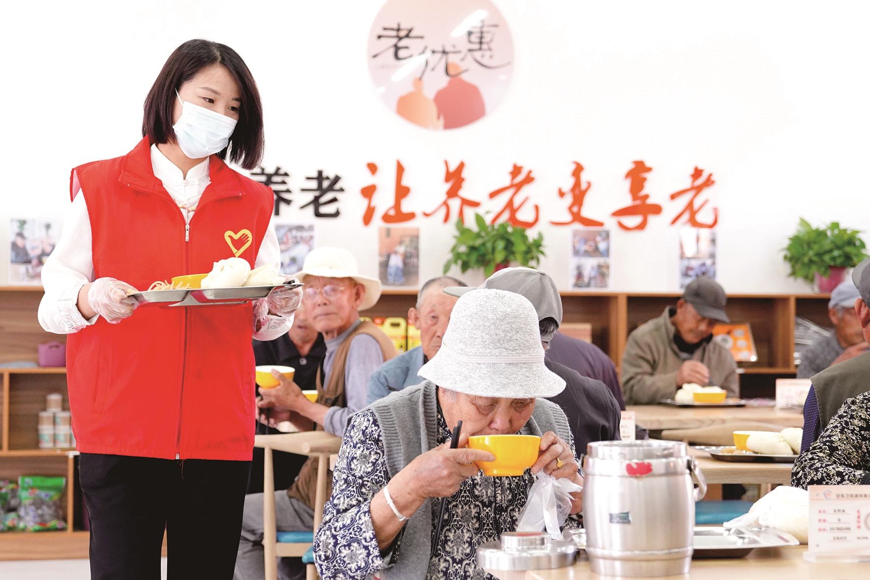 2024年5月10日,在山东省日照市岚山区安东卫街道凤凰山社区养老服务中心,志愿者在为老人端饭。日照市岚山区近年来积极探索新型养老模式,通过“区财政+村级集体+社会各界+老人子女”的共建机制,建设村(社区)级养老综合服务中心。新华社记者 郭绪雷 摄