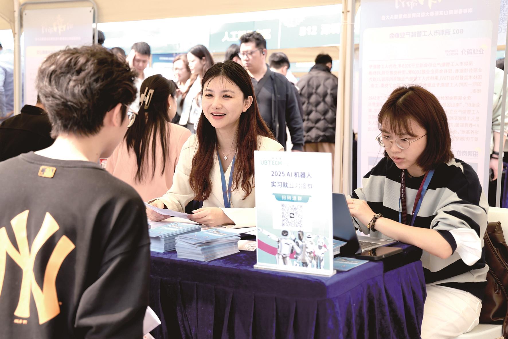 2025年2月18日,科技公司企业负责人在招聘活动现场与求职者交流。当日,2025年深圳市南山区新春大型招聘活动暨猎头大会在深圳湾科技生态园举行,招聘对象包括各类创新型人才、技能型人才、新就业形态人才、灵活用工群体,以及高校毕业生和海外留学生等。新华社记者 毛思倩 摄