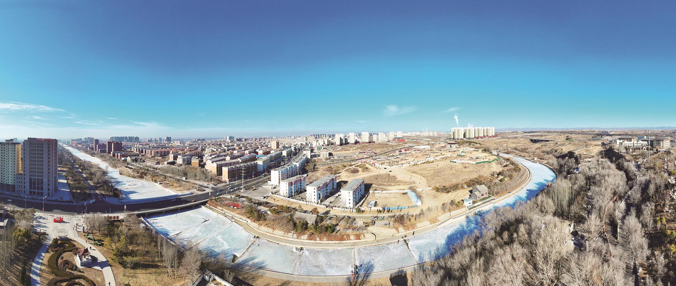 2月25日,俯瞰东河区,湛蓝的天空像是一块澄澈的蓝宝石,长长的河面银装素裹,仿佛一条银色的丝带,将整个城区装点得十分美丽。 记者 李强 摄