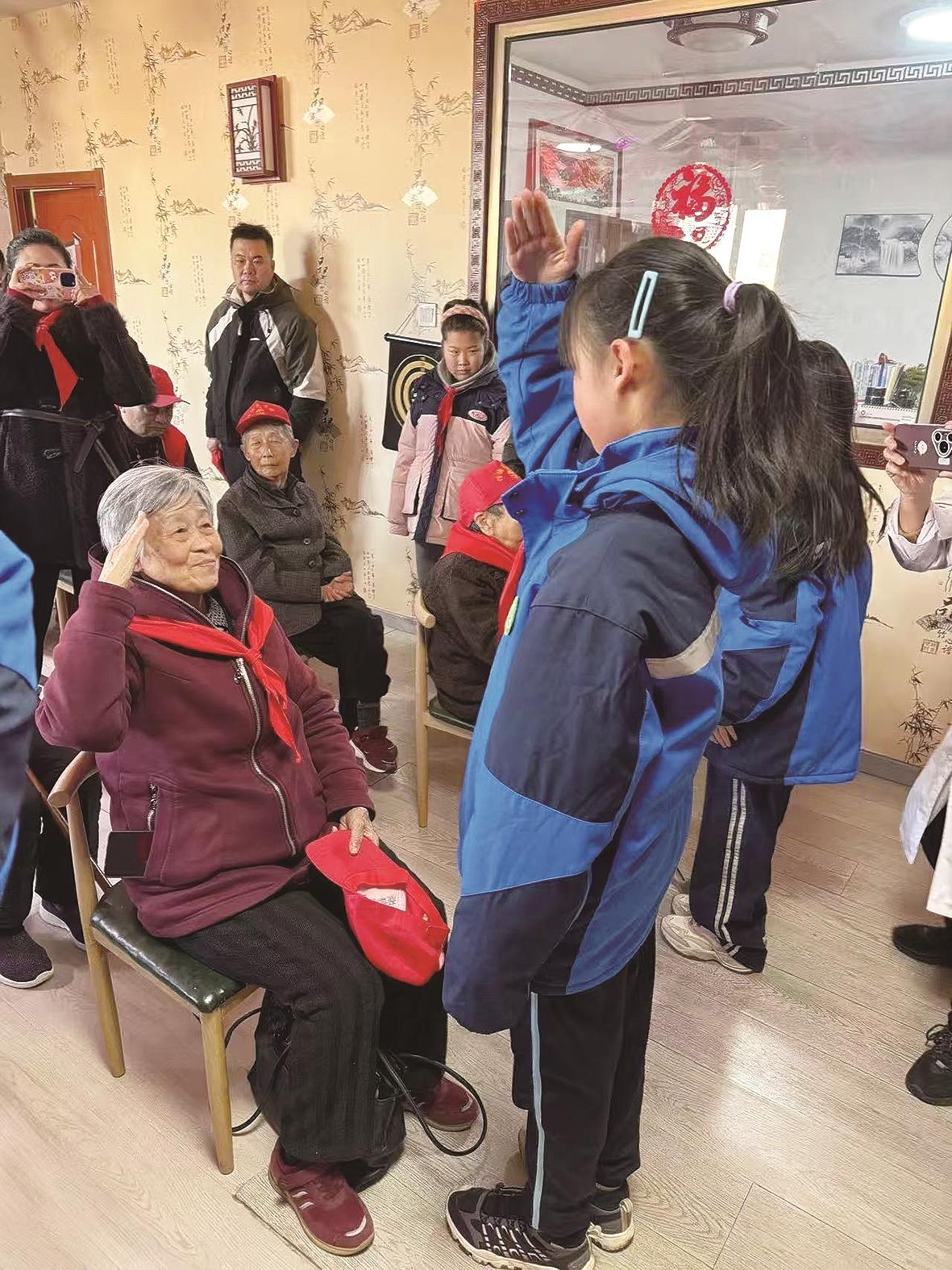 少先队员为爷爷奶奶佩戴红领巾。 记者 孟婧美 摄