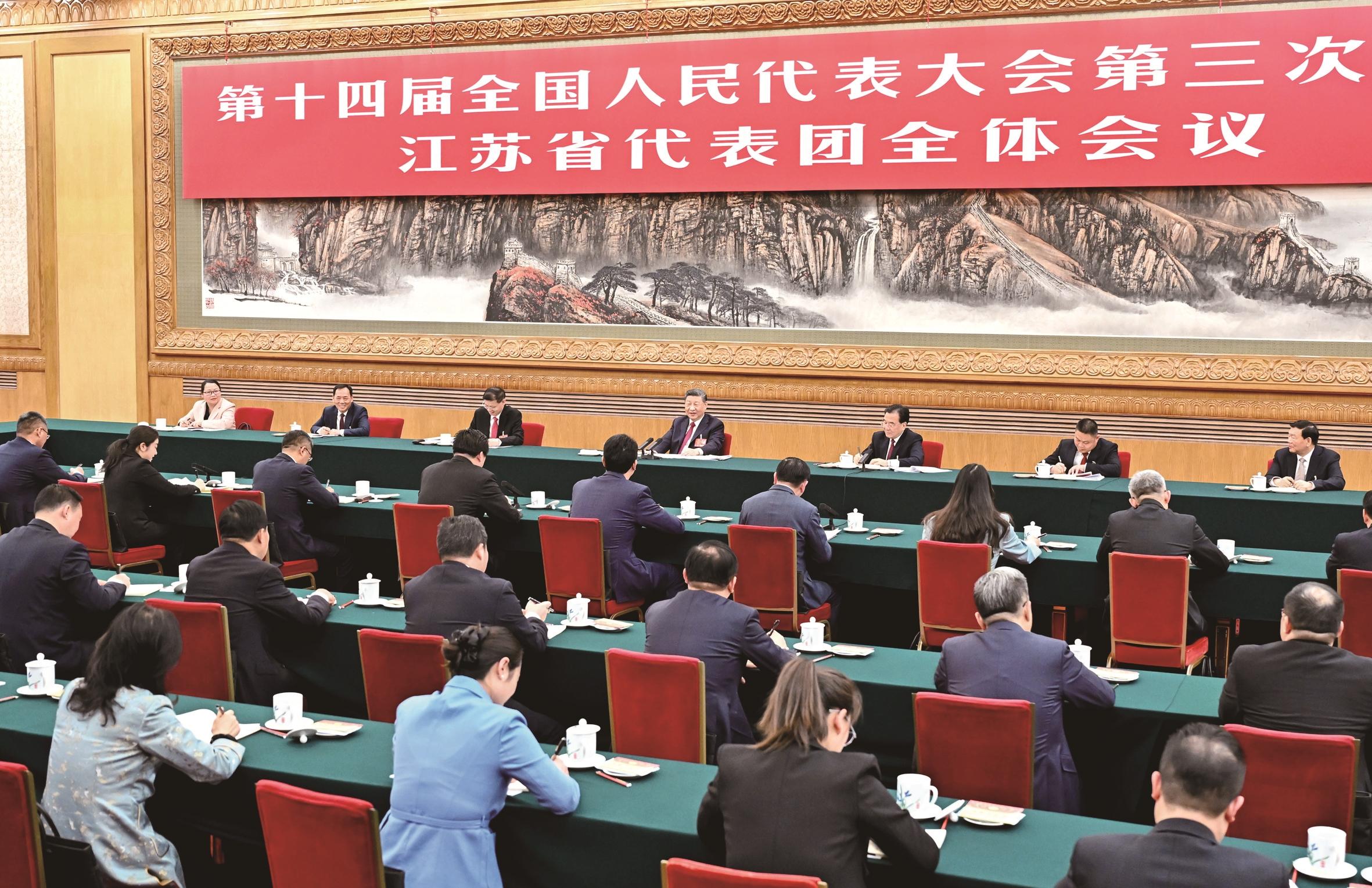 3月5日下午,中共中央总书记、国家主席、中央军委主席习近平参加他所在的十四届全国人大三次会议江苏代表团审议。 新华社记者 燕雁 摄