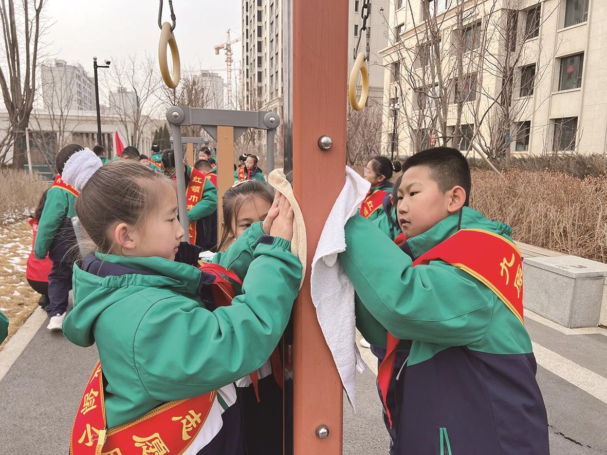 包头市第四十六中学全体团员走进白音席勒街道龙苑B区广场,开展环境清洁、文化宣传和普法宣传志愿服务。九原区第一实验小学的学生们走进远洲社区,擦拭健身器材,并向居民发放宣传手册,普及文明知识。包头市外国语实验学校、九原区二道沙河小学、沙河第二小学教育集团主校区等学校分别开展了讲述雷锋故事、观看雷锋事迹纪录片、为五保家庭清理积雪等形式多样的活动。这些活动不仅让社区环境焕然一新,更让雷锋精神在孩子们心中悄然落地生根,激励他们争做新时代的“雷锋”少年。