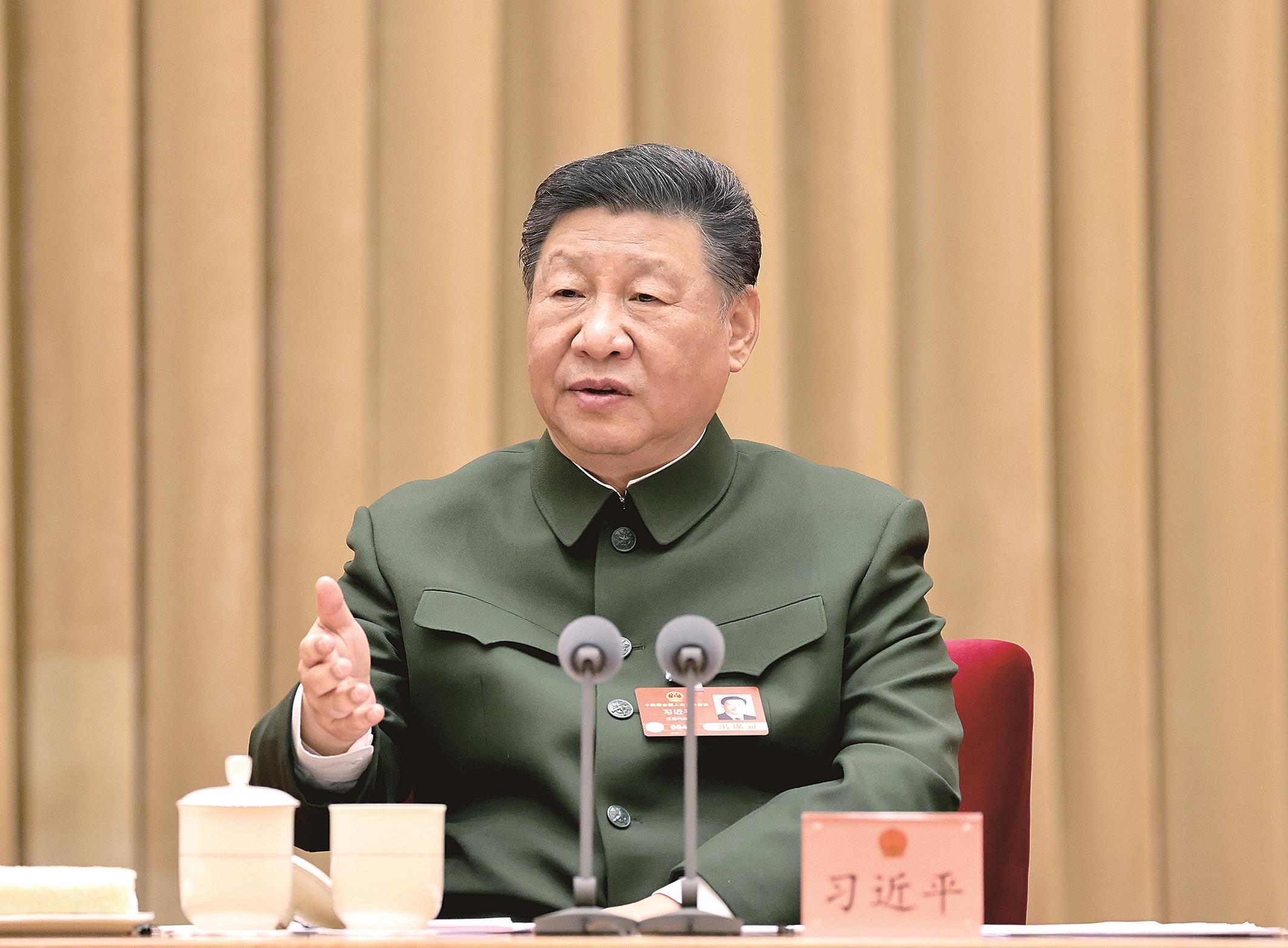 3月7日下午,中共中央总书记、国家主席、中央军委主席习近平出席十四届全国人大三次会议解放军和武警部队代表团全体会议并发表重要讲话。新华社记者 李刚 摄