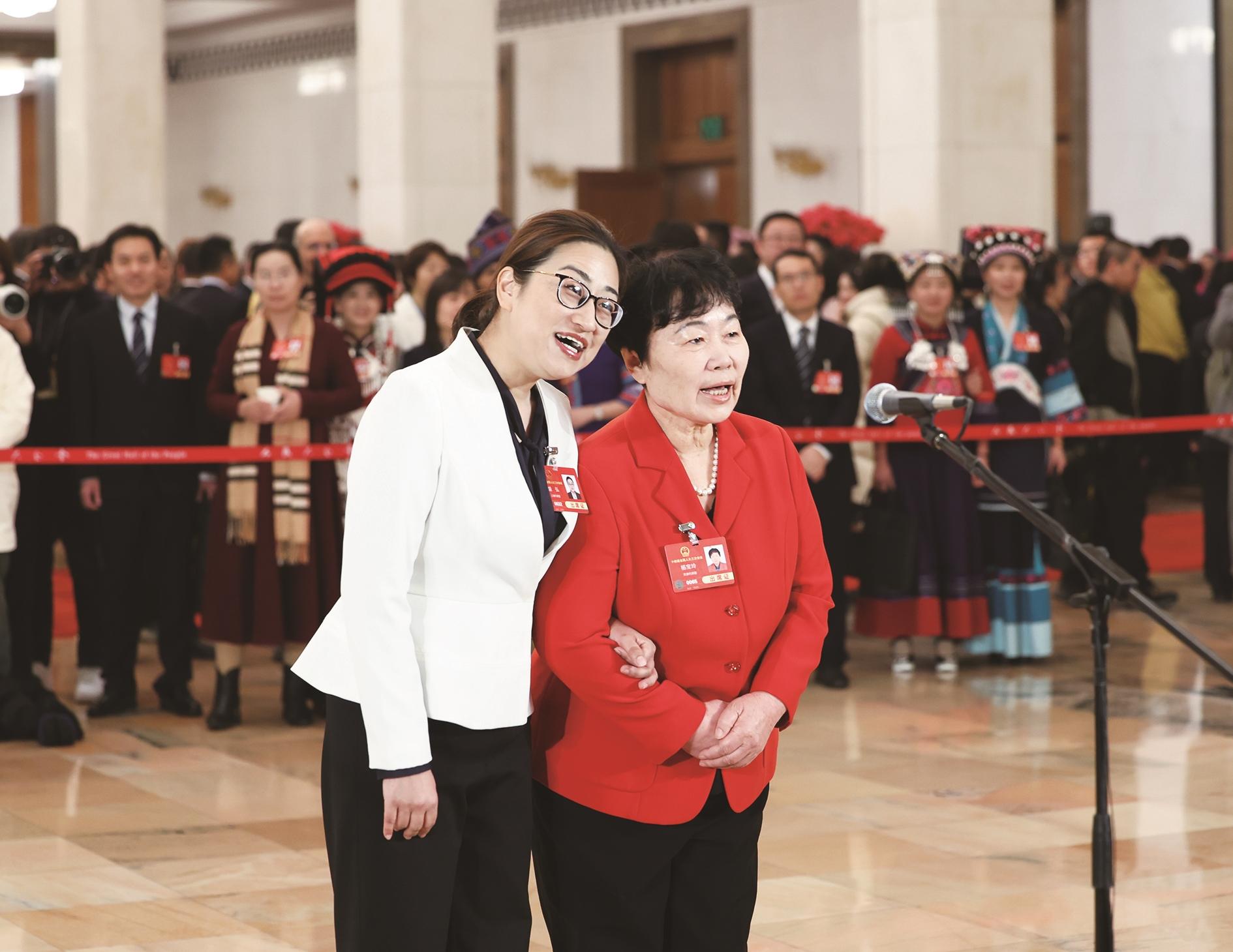 3月8日,第十四届全国人民代表大会第三次会议第二场“代表通道”集中采访活动在北京人民大会堂举行。这是全国人大代表盛弘(左)和杨宝玲向广大妇女致以节日祝福。 新华社记者 吕帅 摄