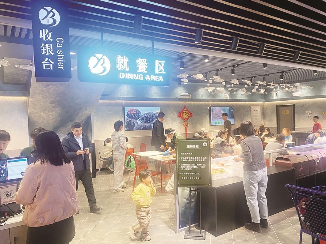 亲手挑一条多宝鱼、选一斤鲜活的大虾,交给大厨现场宰杀清洗再烹饪,顺便再买点凉拌菜,或是买点水饺由师傅现煮。而且,还可以根据自己的喜好对口味进行选择,清蒸还是红烧或是盐焗,要加点辣还是加点甜,都可以现场与大厨沟通……10~20分钟后,热气腾腾的海鲜就能上桌,这样新鲜的体验吸引了很多市民。记者了解到,该超市推出新餐饮模式以来,海鲜制作区经常爆满,尤其是春节期间,海鲜柜台单日销量超过10万元,选购需要排长队。