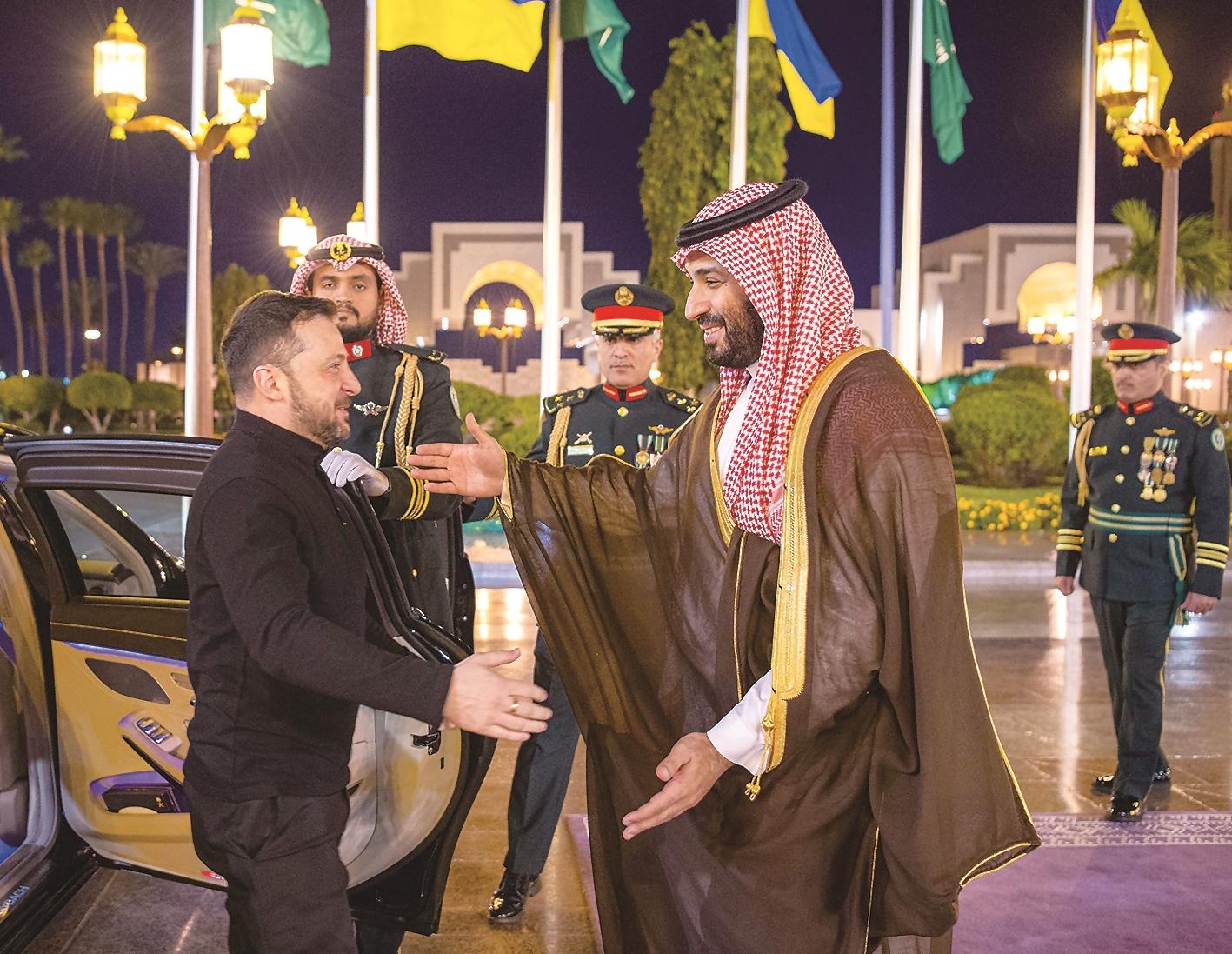 3月10日,沙特阿拉伯王储兼首相穆罕默德在吉达会见到访的乌克兰总统泽连斯基。这是会谈前,穆罕默德(前右)为泽连斯基举行欢迎仪式。 沙特阿拉伯王储兼首相穆罕默德10日在沙特西部海滨城市吉达分别会见到访的乌克兰总统泽连斯基和美国国务卿鲁比奥,强调沙特支持一切旨在解决危机、实现和平的国际努力。新华社发(沙特通讯社供图)