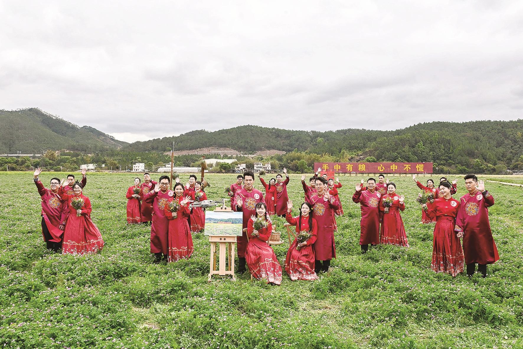 当日,“紫云花海 映影幸福”乡村绿美文化婚庆活动在广东河源市东源县柳城镇万绿智慧农场内举行。15对新人参加集体婚礼,在紫云英花海的见证下,通过植树、花田婚拍等活动践行婚俗新风尚,倡导简约环保的婚庆理念。