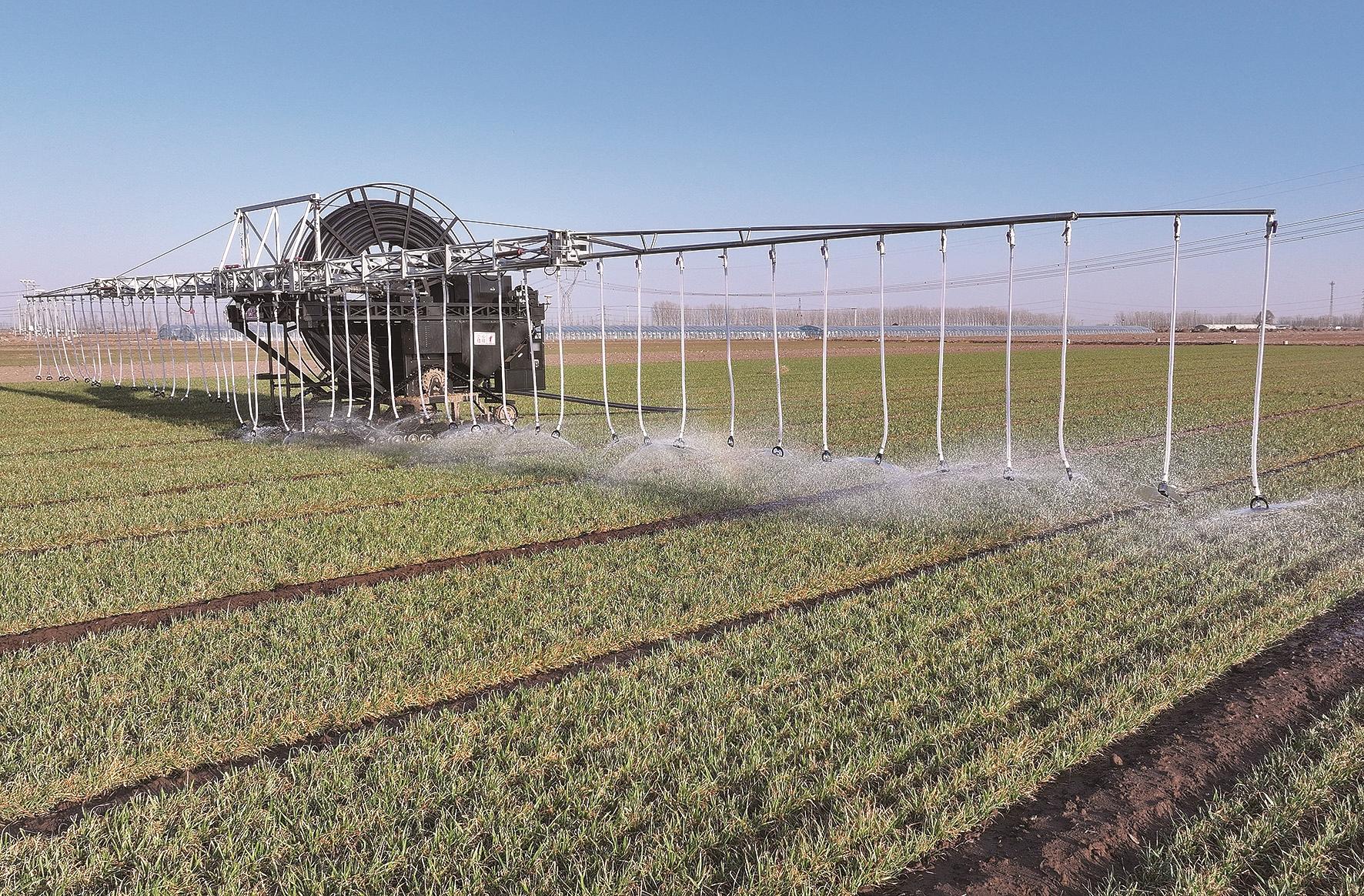3月17日,一台自走式水肥一体农田喷灌设备在河北省唐山市丰南区东田庄镇的冬小麦田间进行喷灌作业。