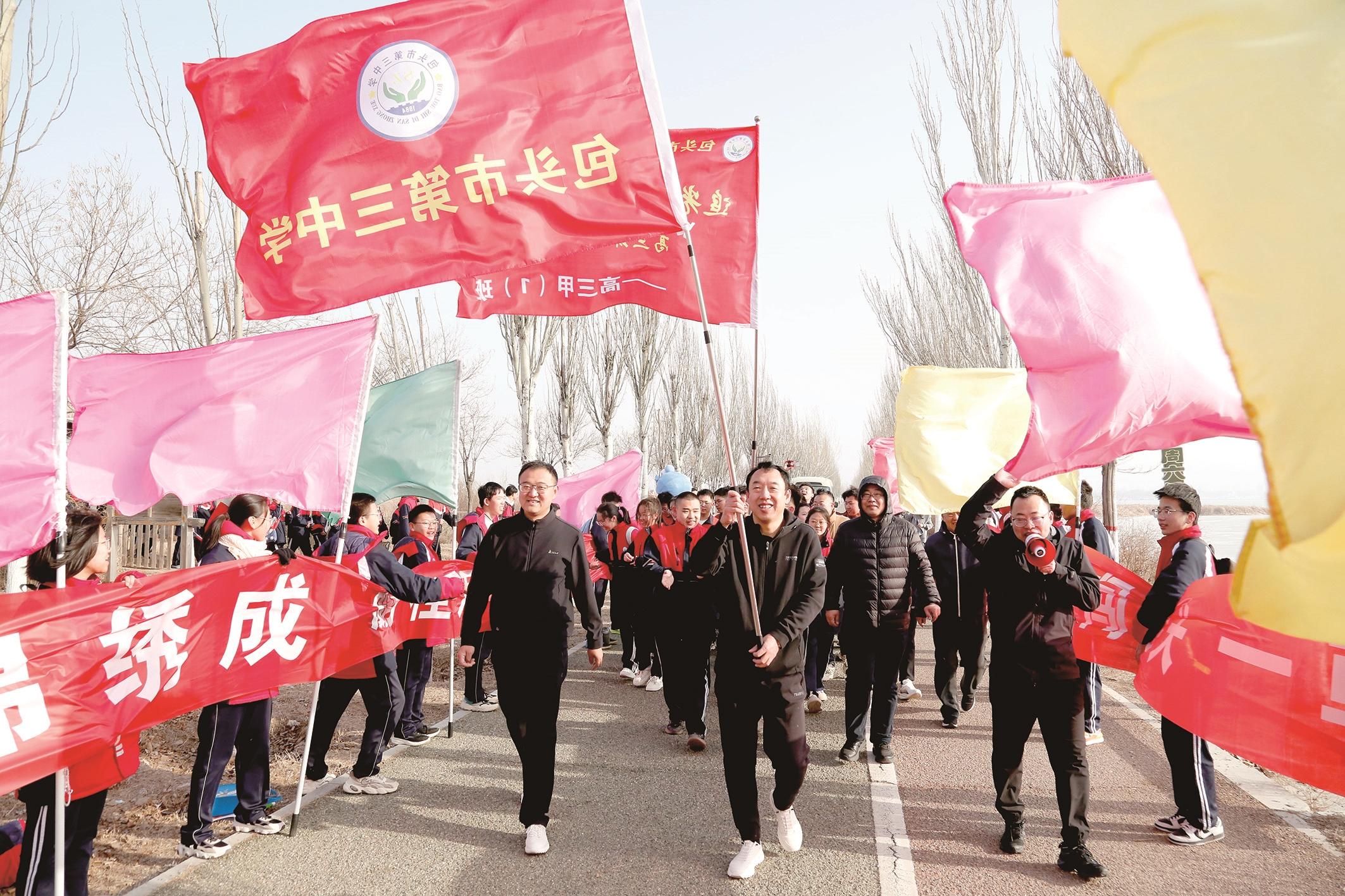 本报讯 三月初春,万物萌新。为帮助高三学子释放压力、锤炼意志力,近日,包头市第三中学举办“追光踏浪,循梦而行”高三年级师生18公里环湖励志行活动。