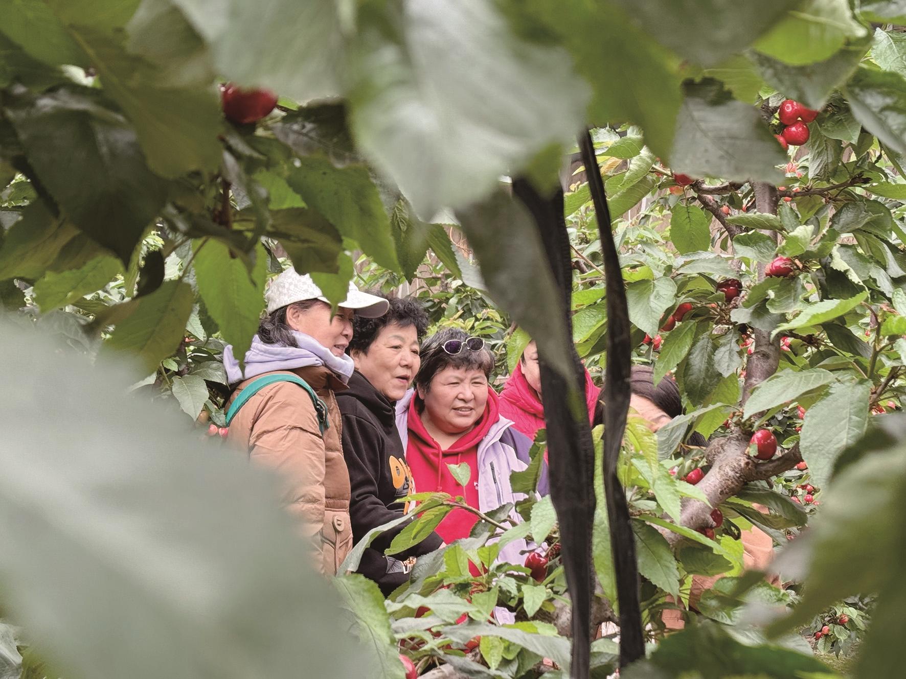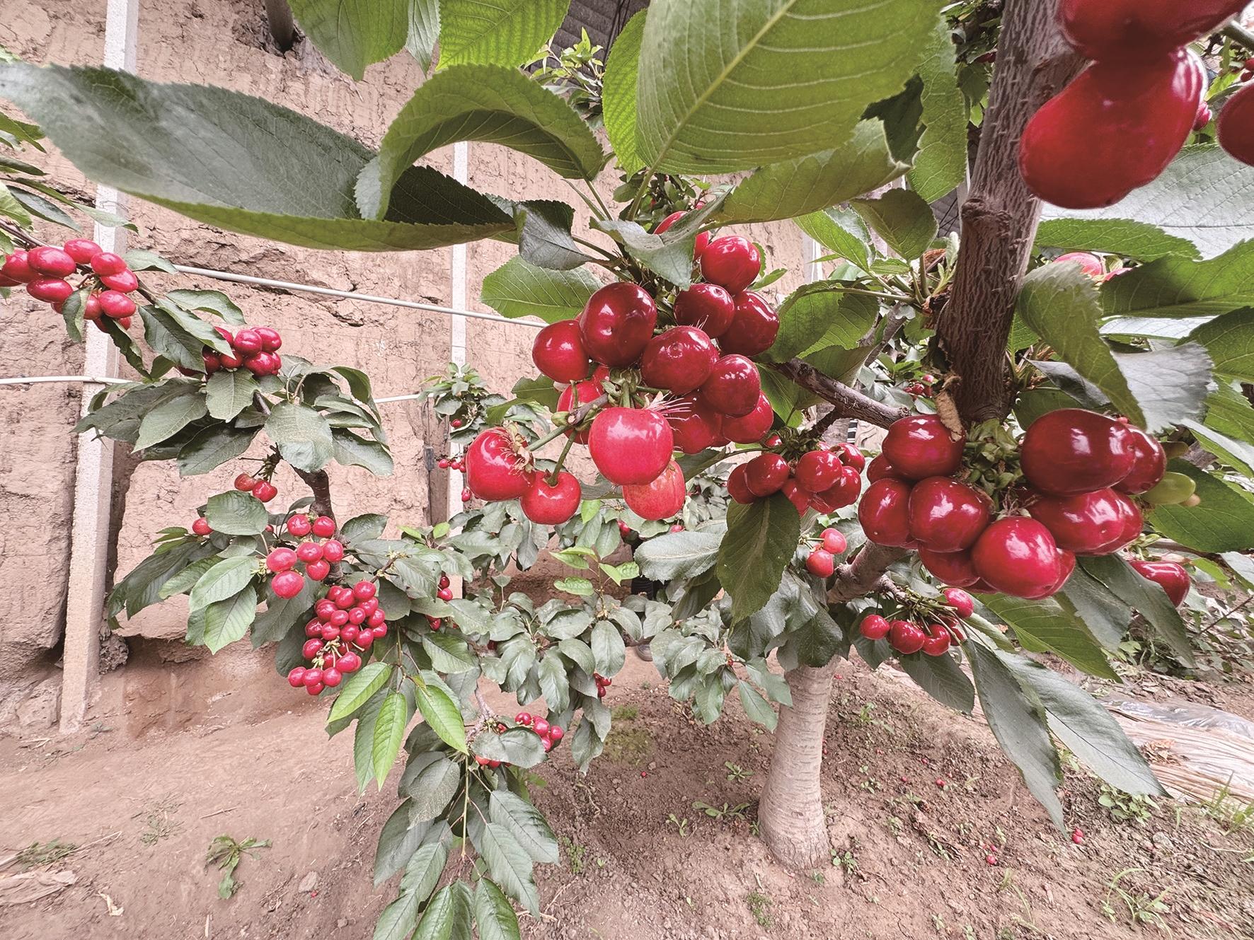 郁郁葱葱的樱桃林里鲜红欲滴的樱桃果已经挂满枝头,游客们争相采摘品尝新鲜的樱桃,一场关于如何让本土樱桃高质量发展的“头脑风暴”也在大棚里上演。