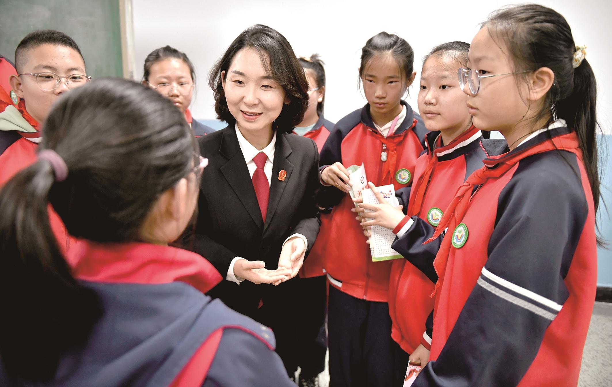 图为达茂旗人民法院卜慧敏法官在课余间隙与学生开展法律知识咨询互动。