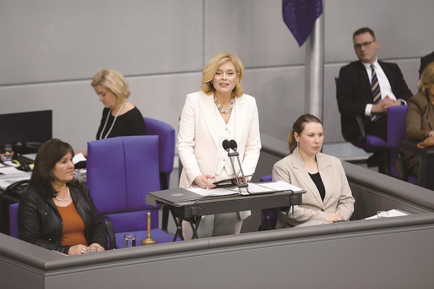 3月25日,在德国柏林,新当选德国联邦议院议长尤利娅·克勒克纳(中)在联邦议院发表讲话。 新一届德国联邦议院25日召开第一次全体会议,来自基督教民主联盟的尤利娅·克勒克纳当选新一届联邦议院议长。新华社记者 杜哲宇 摄