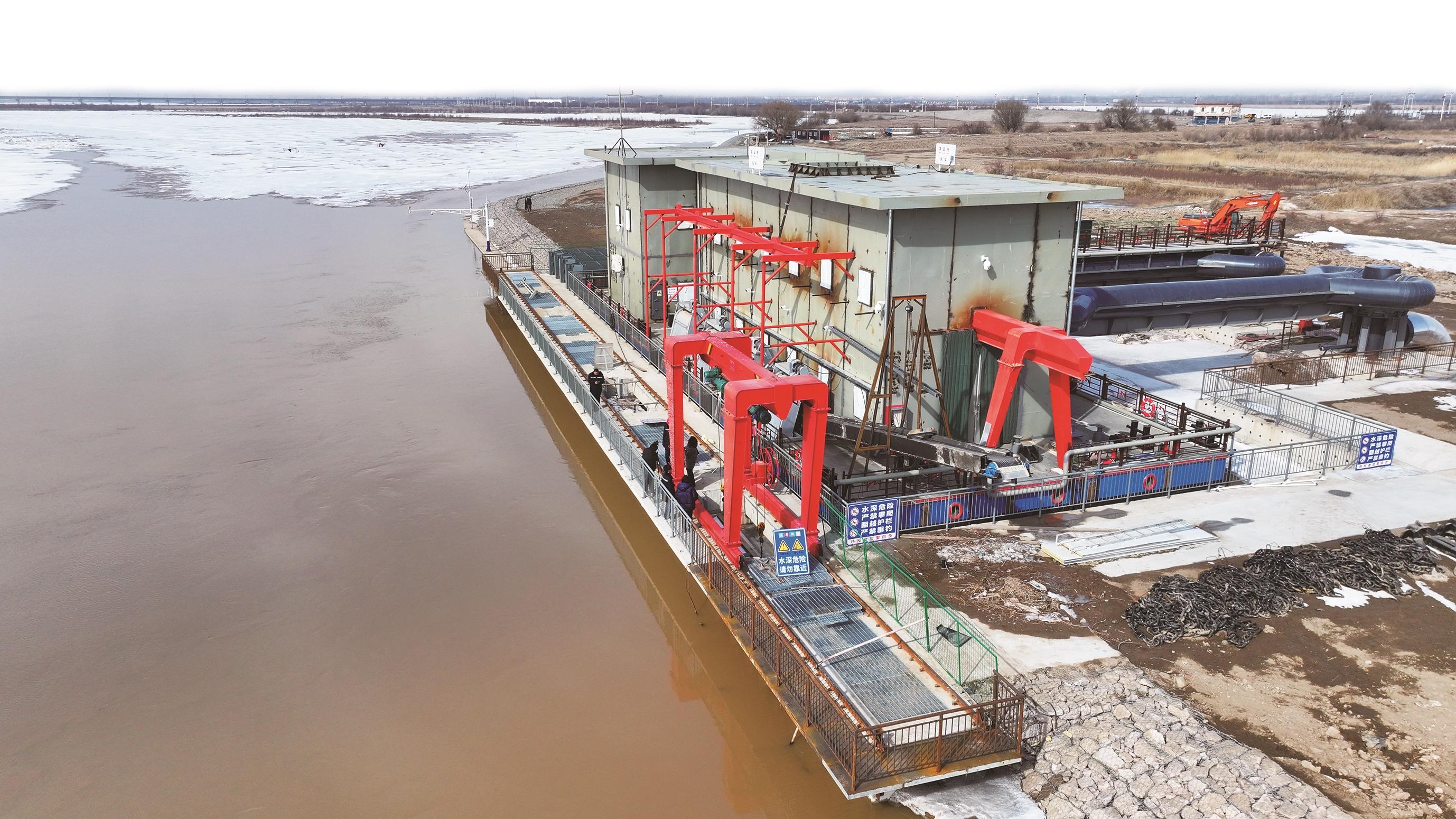 浮船泵站不同于传统固定式泵站,无须建造建筑物,大幅降低投资成本。泵船采用先进的模块化生产,安装快捷,可有效缩短建设工期。生产过程采用自动控制系统,一键启停、操作简便。泵船进水口位于水面以下1.8米,配备4个大型万向节,能随水位自动升降,可灵活适应水位涨落,确保取到杂质较少的黄河水,且取水能力不受影响。这些优势极大地提升了城市供水的质量、效率与可靠性,既保障泵船全天候正常运行,又维持河道行洪的畅通无阻