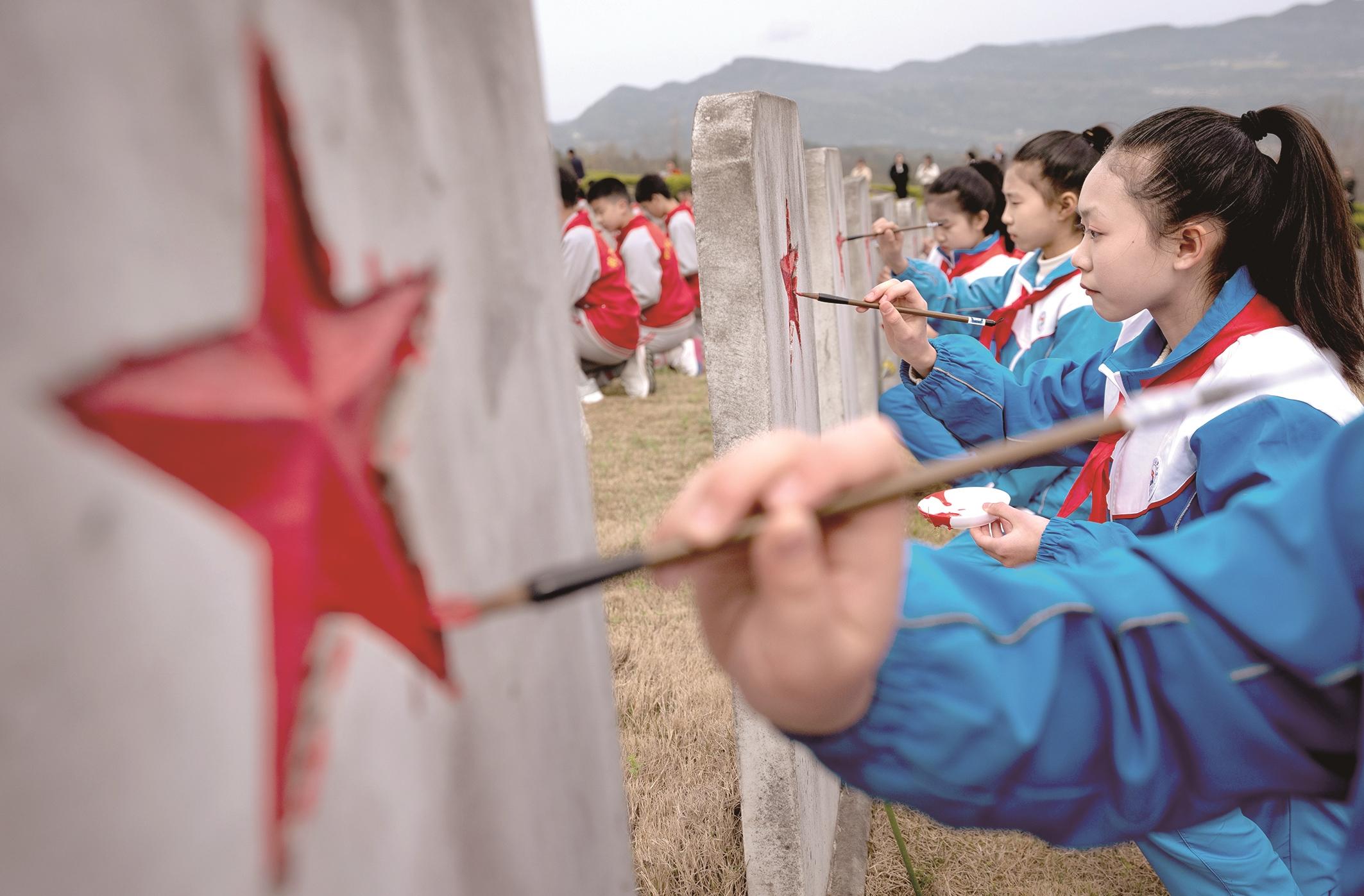图为在川陕革命根据地红军烈士陵园,红军小学学生为无名烈士墓碑上的五角星描红。
