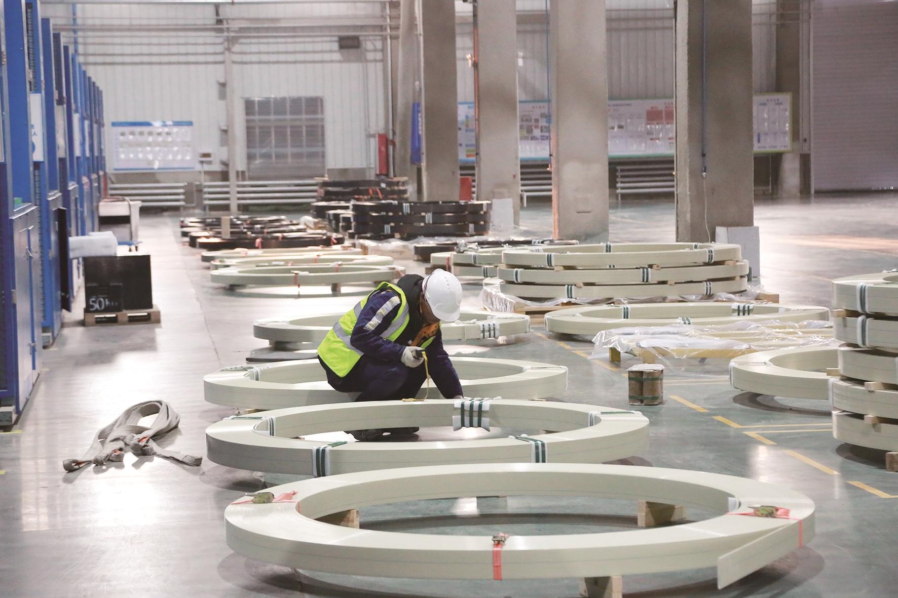 走进明阳北方智慧能源(内蒙古)有限公司包头基地,风机传动链对轴工作、部件检查、位置调整……有序运转的生产线和忙碌的工人随处可见。生产机器人挥舞着“手臂”,数据管理大屏上数字跃动,风机主机装配“一气呵成”。一季度数据显示,企业已实现产值40亿元,为全年150亿元产值目标的实现奠定坚实基础。