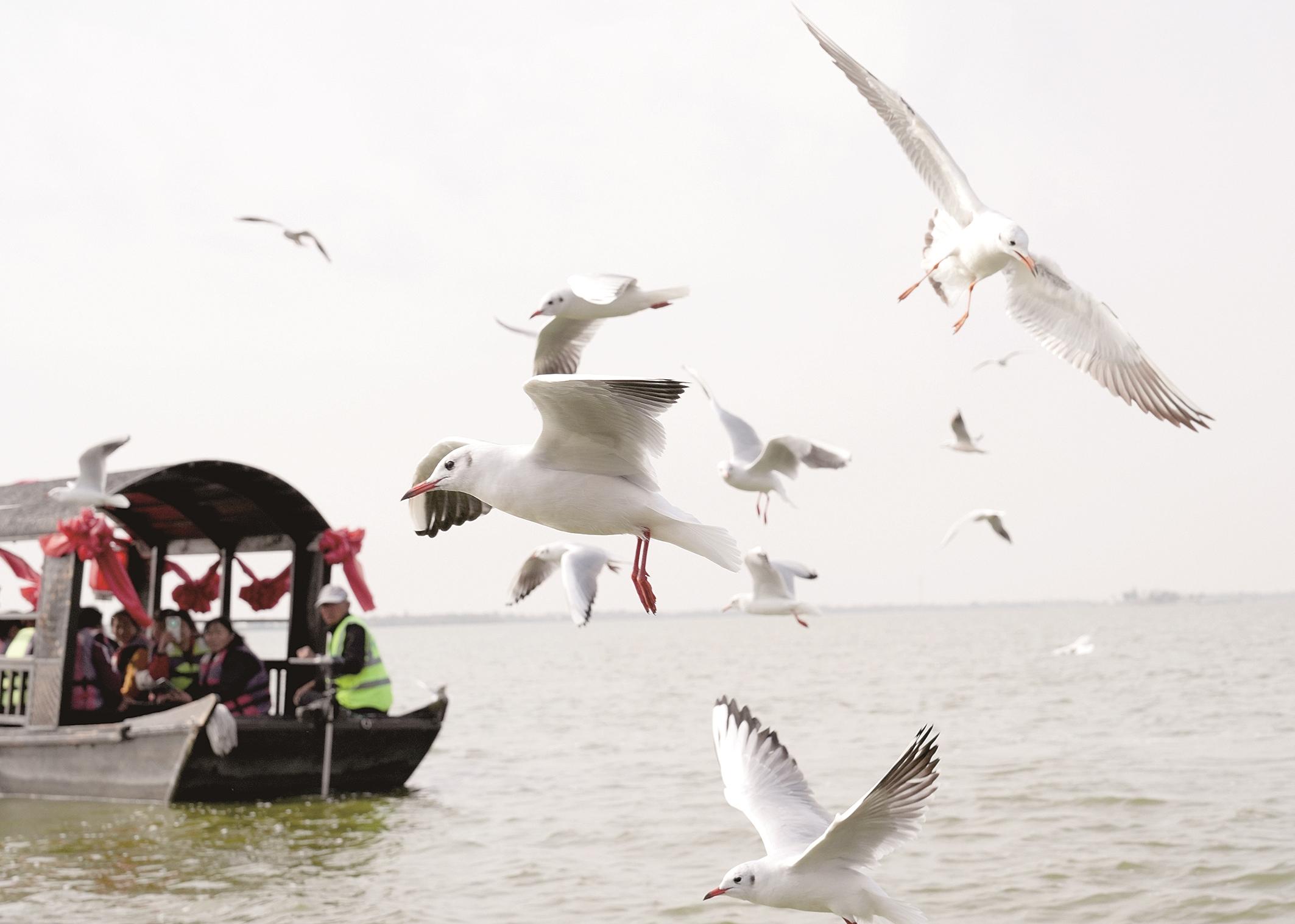 南海湿地公园内,成群的红嘴鸥围着乌篷船飞行。