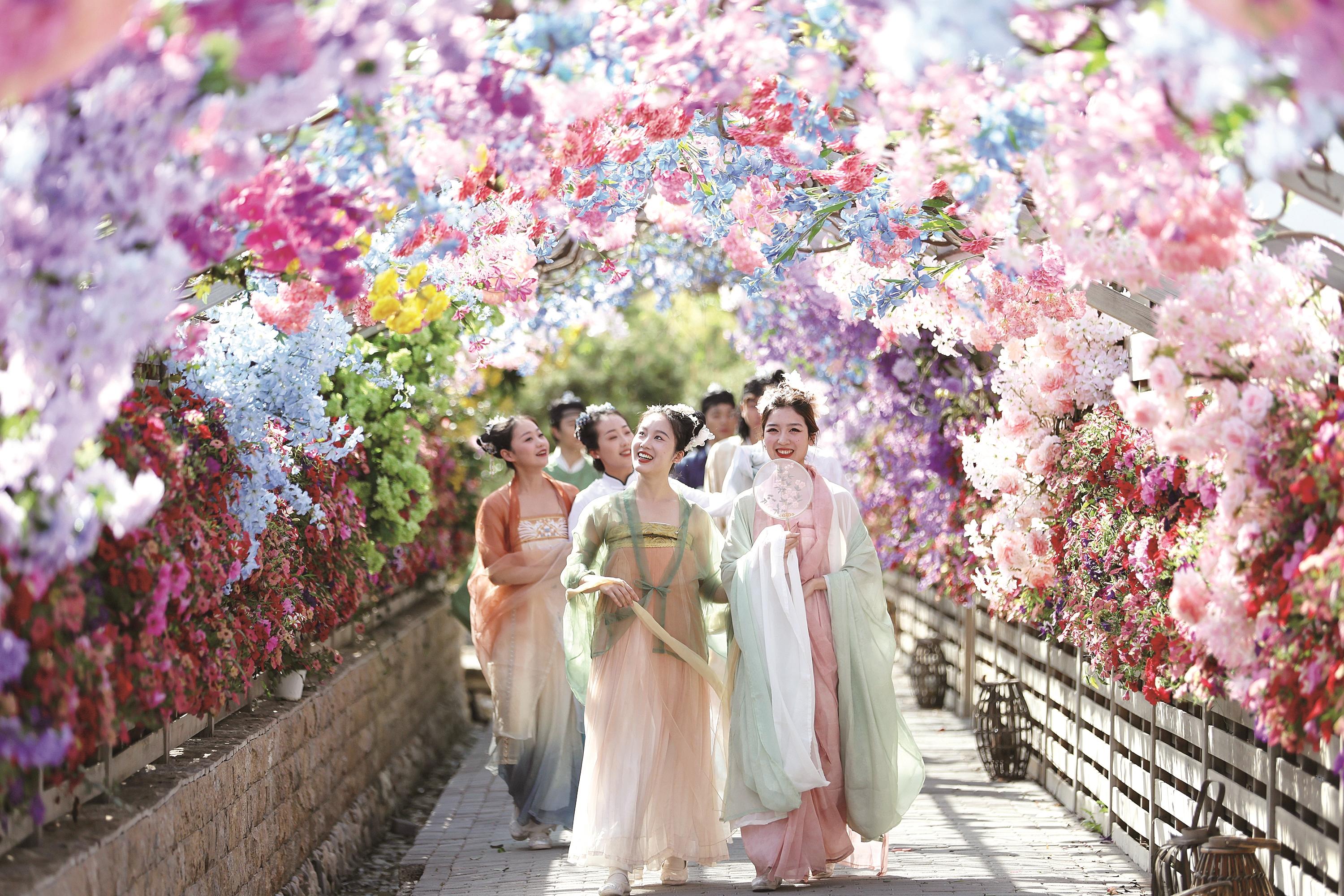 4月6日,在山东省郯城县醉东风乡村艺栈,身着传统服饰的演员为游客表演。