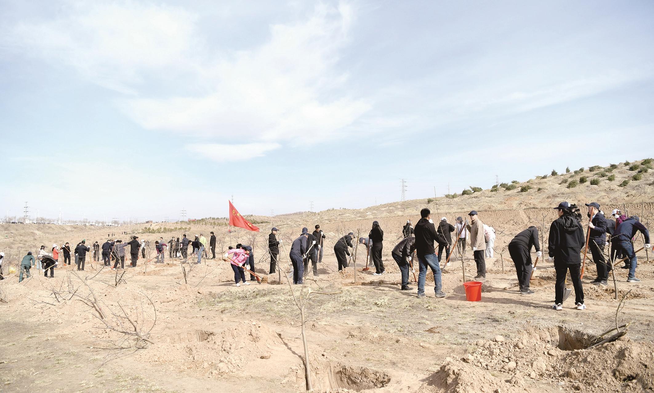 4月10日,包头市2025年全民义务植树活动现场。记者 吴杰 摄
