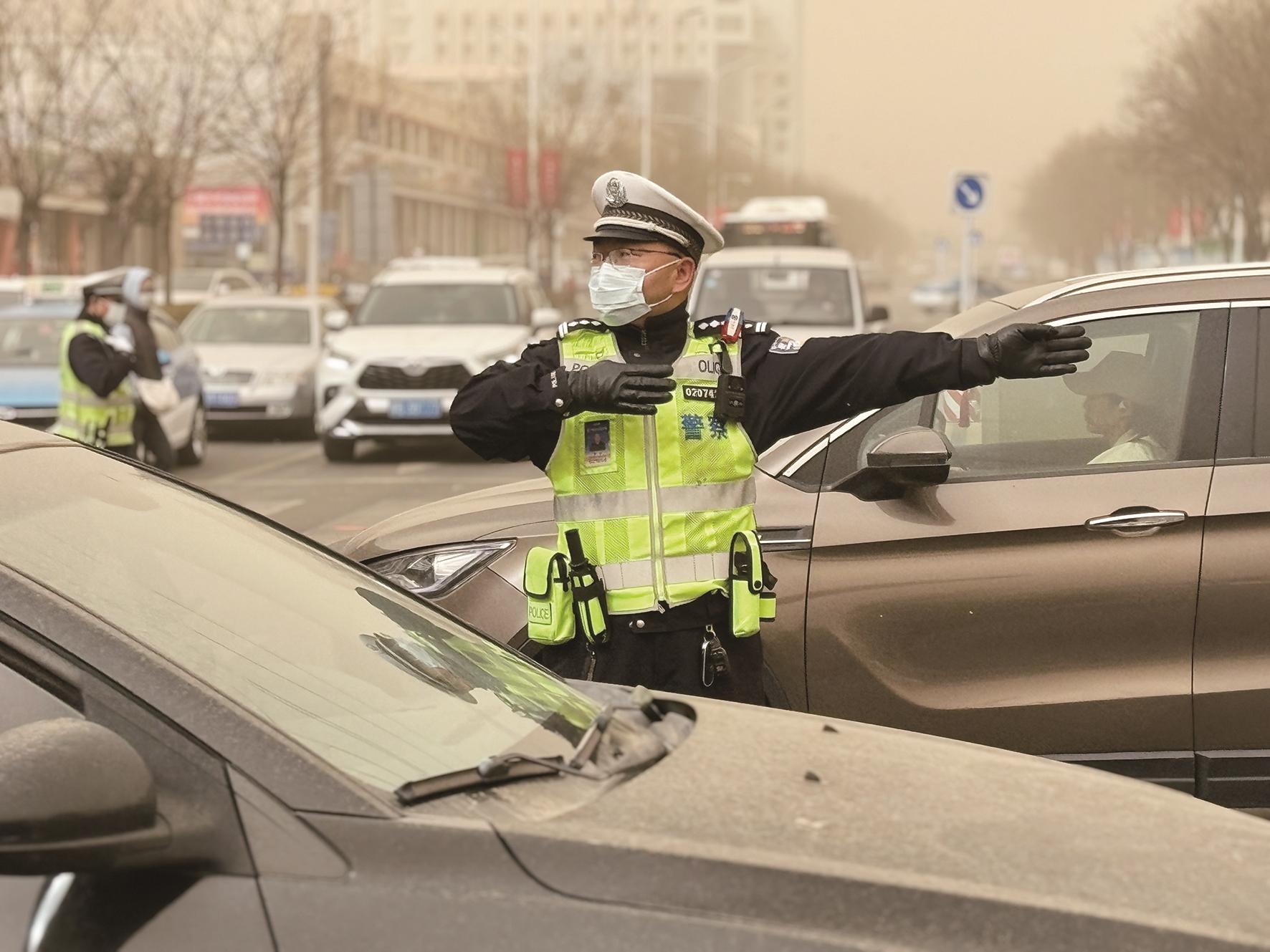 在城区主干道上,民辅警采取定点执勤与动态巡逻相结合的方式,加强重点路段指挥疏导,引导车辆减速慢行,及时排查、清理因沙尘导致的道路隐患,全力保障道路交通安全,用“辛苦指数”换取市民群众出行的“安全系数”。