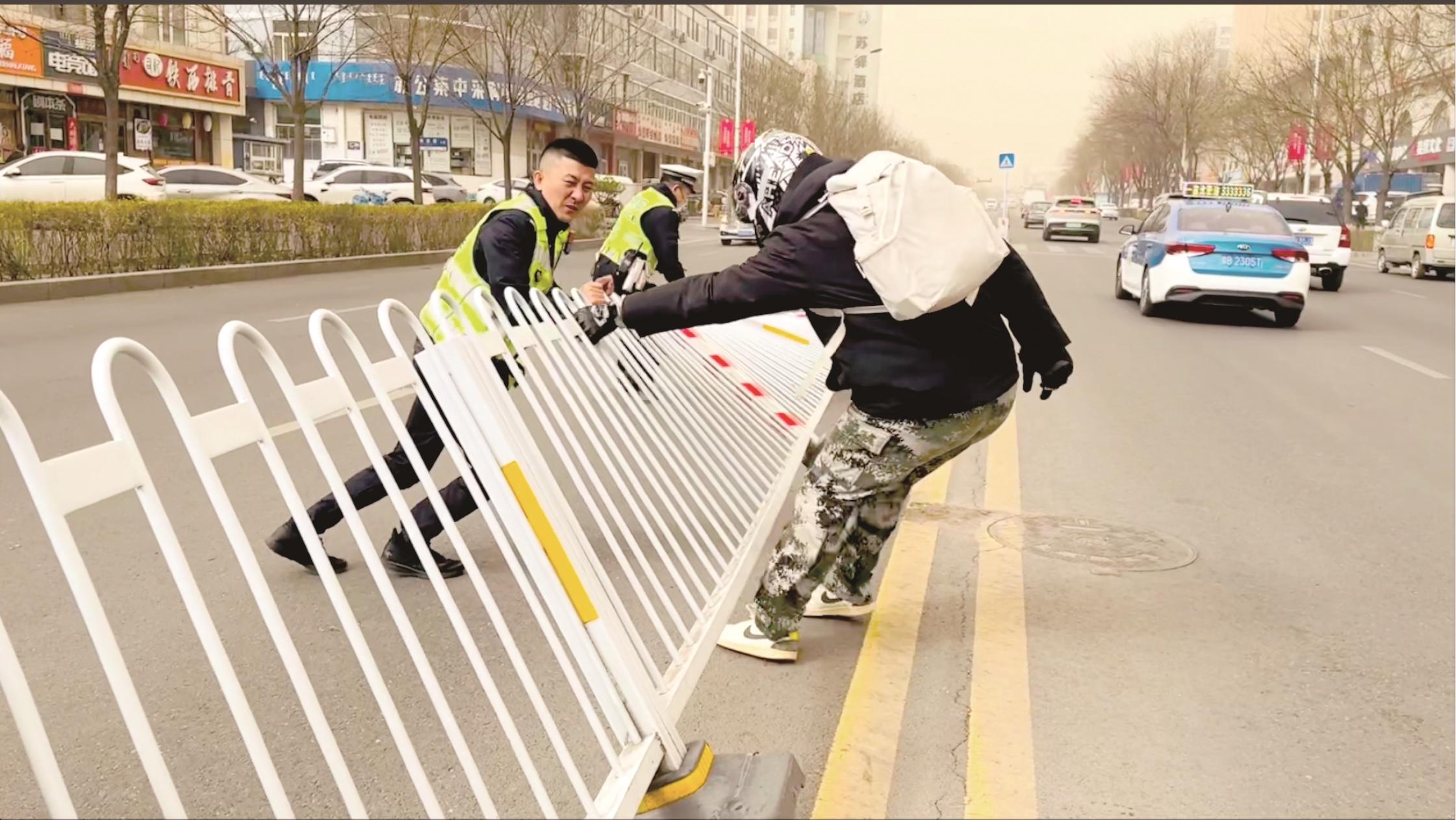 4月13日上午,记者见到了这位“00后”少年。黑色运动服搭配头盔,骑着电动车的刘隽其浑身透着青春气息。“那天下午4点,学校因极端天气提前放学。”刘隽其回忆,他骑行至东河区太平寺附近时,狂风将百米长的马路隔离护栏掀翻在地。四五名交警正顶着风沙,艰难地扶起沉重的护栏。看到此情景,刘隽其立即停好电动车,快步冲向风沙中的“战场”。