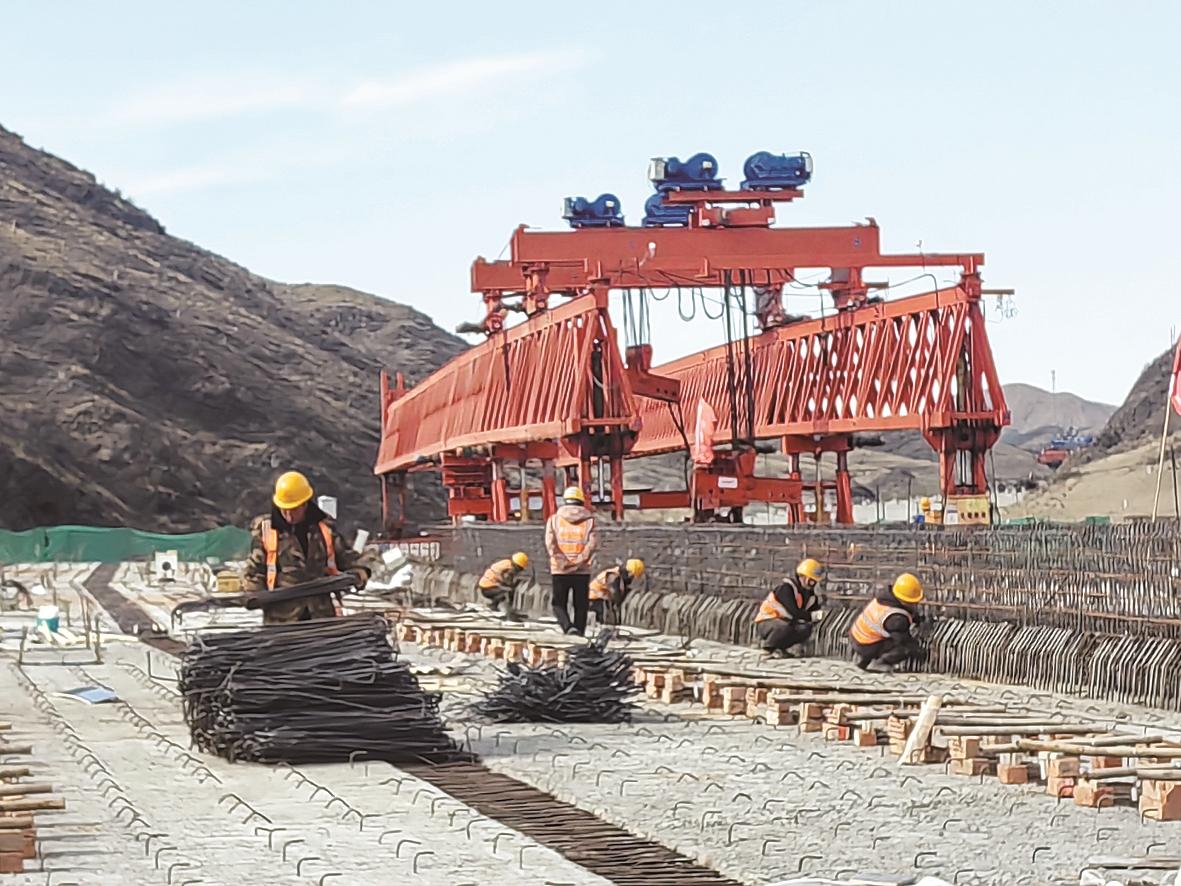 在桥梁拼装区,两台巨型架桥机的组装工作进入最后冲刺阶段。指挥员手持对讲机,在钢铁骨架间穿梭,精准指挥工人拧紧每一颗螺栓。据相关负责人介绍,这两台设备是后续吊梁作业的关键,目前主体拼装已完成,正在进行荷载试验和系统调试,预计五一节后即可通过验收,投入使用。