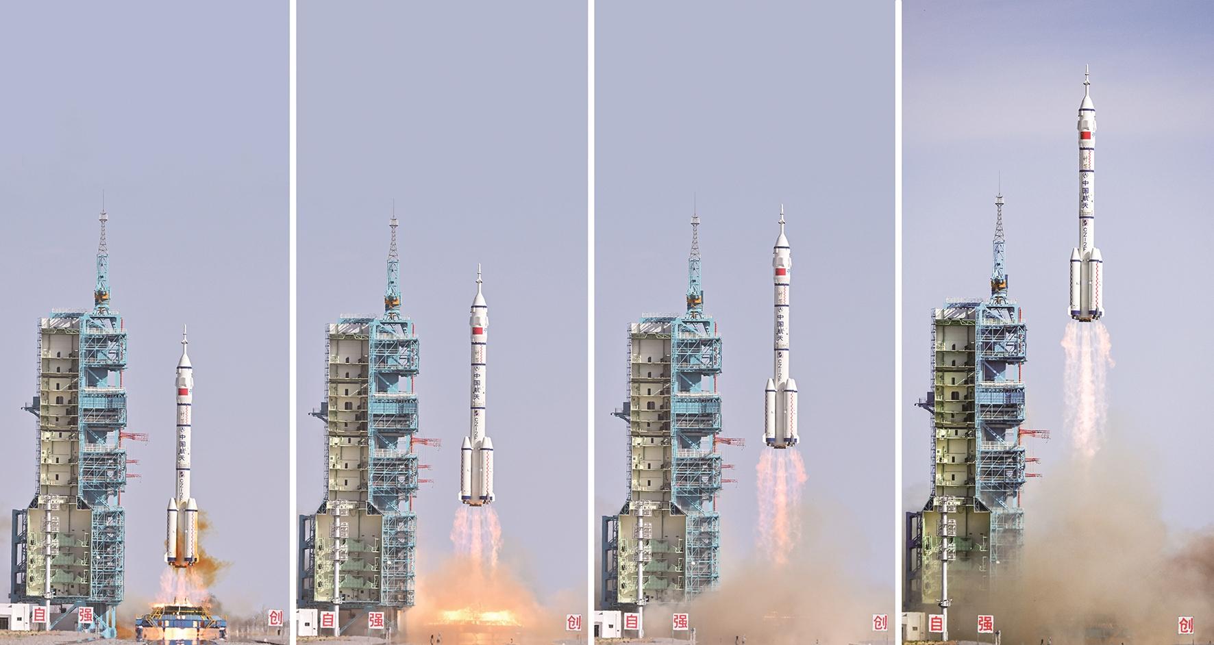 四月二十四日,搭载神舟二十号载人飞船的长征二号F遥二十运载火箭在酒泉卫星发射中心发射(拼版照片)。 新华社记者 连振 李鑫 摄