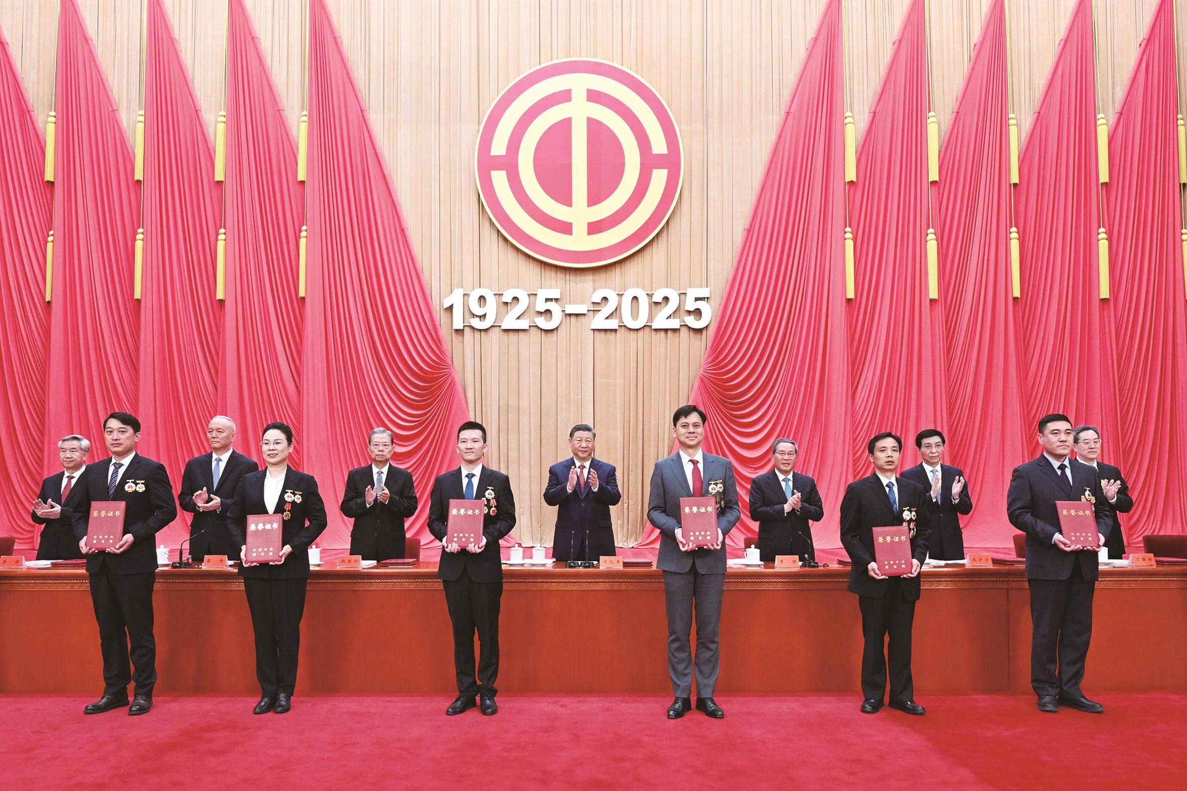 人民大会堂大礼堂气氛隆重热烈。主席台上方悬挂着“庆祝中华全国总工会成立100周年暨全国劳动模范和先进工作者表彰大会”会标,后幕正中悬挂中国工会会徽,会徽下方是“1925-2025”字标,10面红旗分列两侧。二楼眺台悬挂着标语:“以习近平新时代中国特色社会主义思想为指导,坚定不移听党话跟党走,在以中国式现代化全面推进强国建设、民族复兴伟业中充分发挥工人阶级主力军作用和工会桥梁纽带作用!”