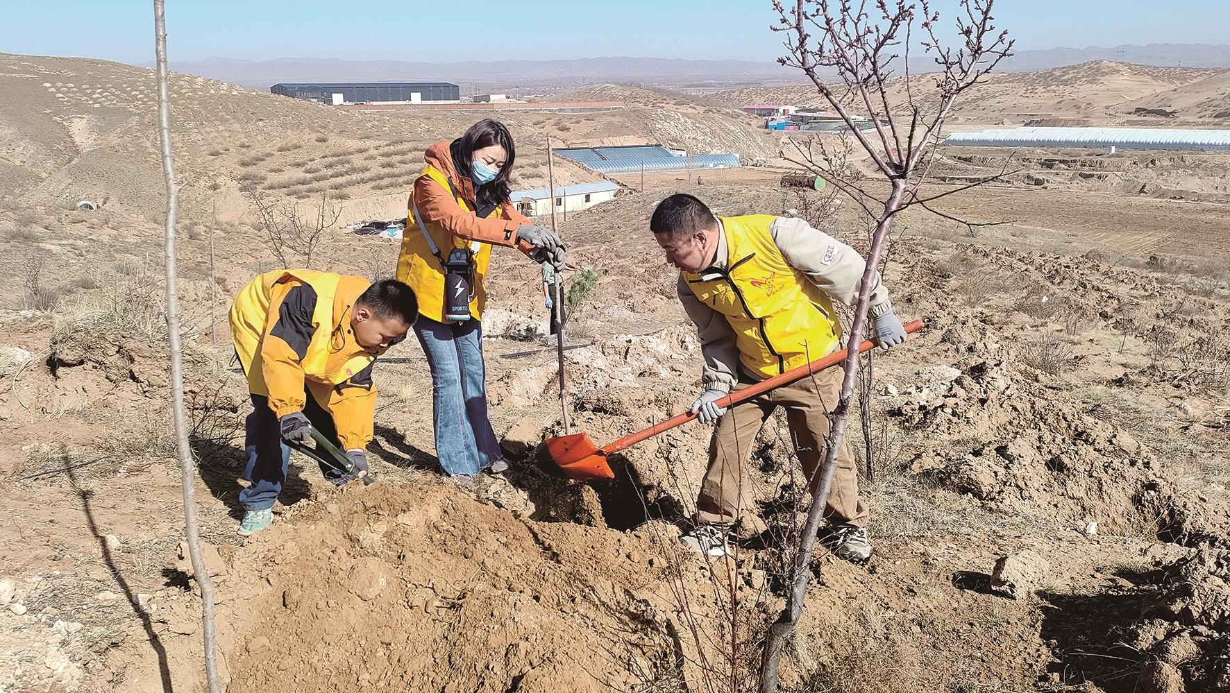 图为义工一家三口正在植树。