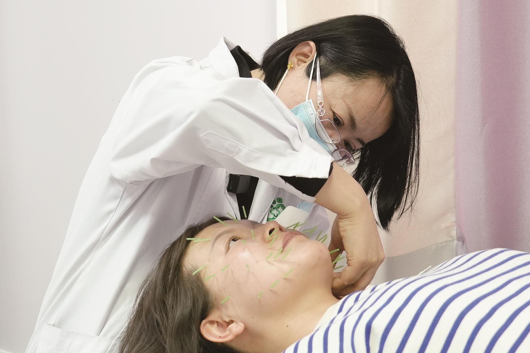中医经络抗衰同样受到社区居民的青睐。随着年龄增长,不少女性都为面部肌肤松弛、皱纹增多而烦恼。而在社区服务中心通过针灸、埋线等经络抗衰手段,能促进面部血液循环,达到淡斑、抗皱、提亮肤色等效果。“我已经做过3次经络抗衰,感觉脸部皮肤紧致不少,整个人都精神了!”家住赛罕街道井卜石美好家园的王女士高兴地说。