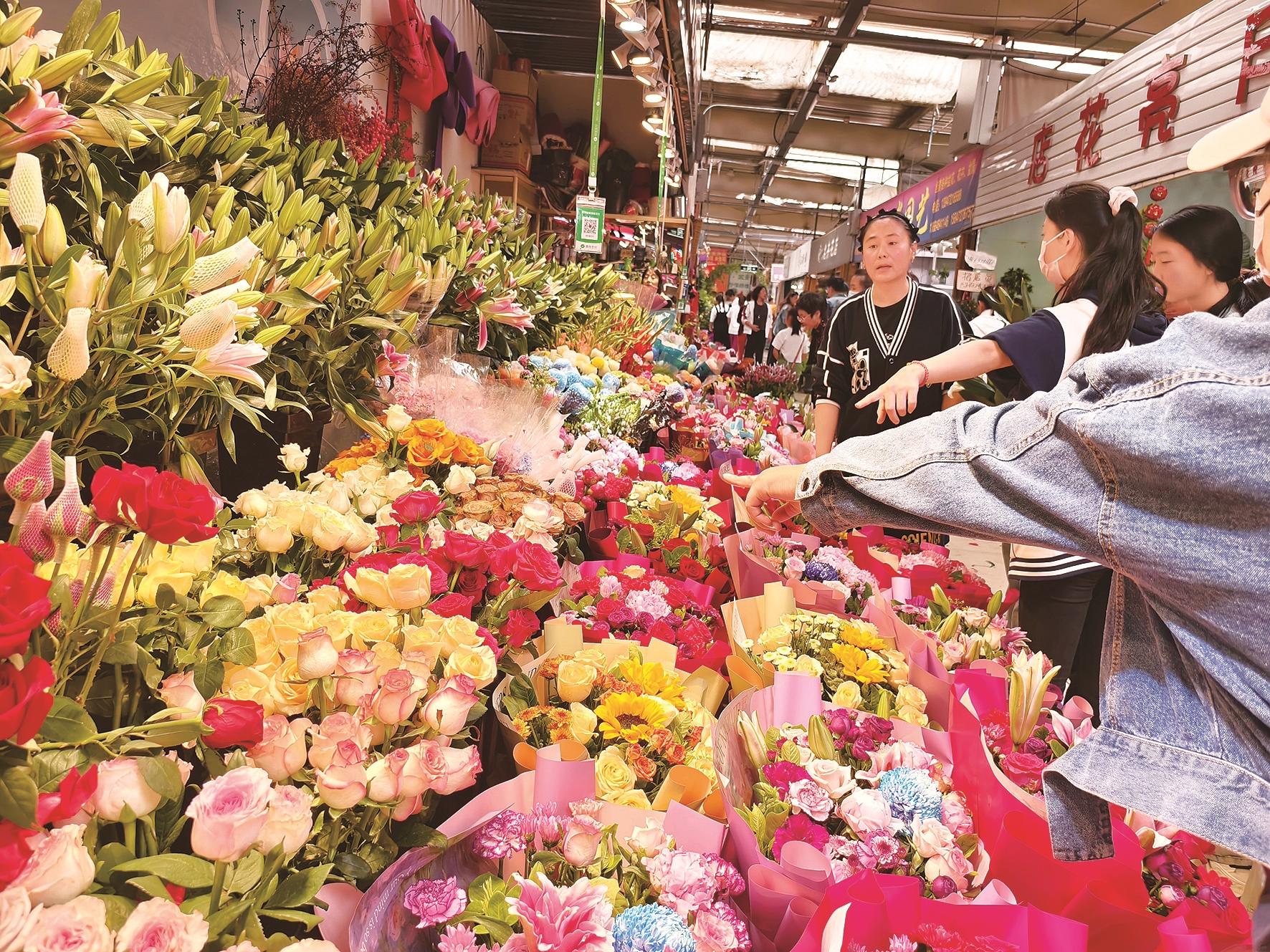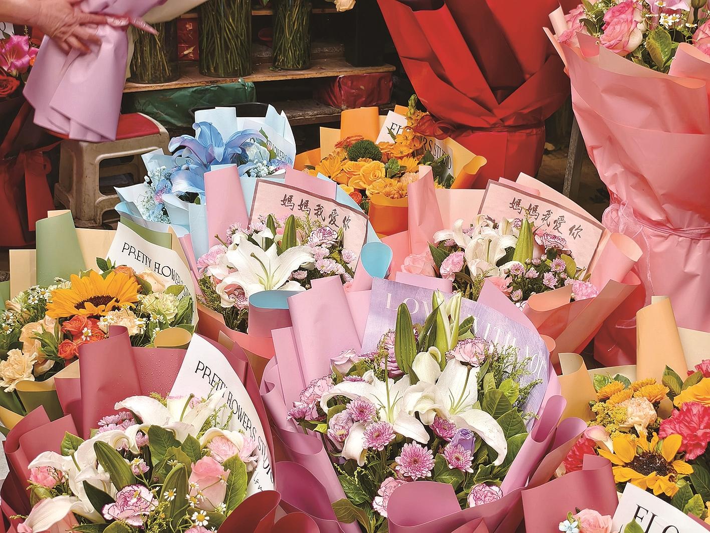 本报讯 5月11日,母亲节恰逢周末,花苑内人潮涌动,鲜花销售异常火爆,康乃馨、百合、玫瑰等花朵争奇斗艳,吸引众多市民选购。大家挑选着心仪的花束,借芬芳的鲜花向母亲传递感恩与爱意。
