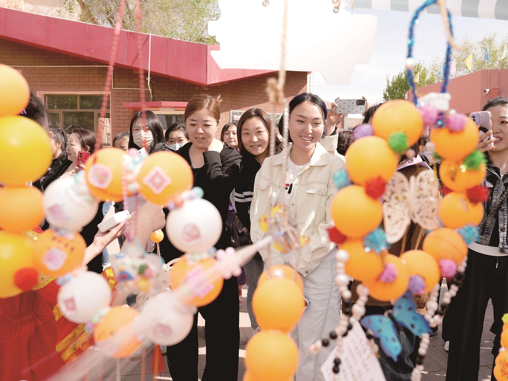 图为家长们看到孩子们用乒乓球和乒乓球球拍制作的各种手工艺品,露出了喜悦的笑容。 记者 李强 摄