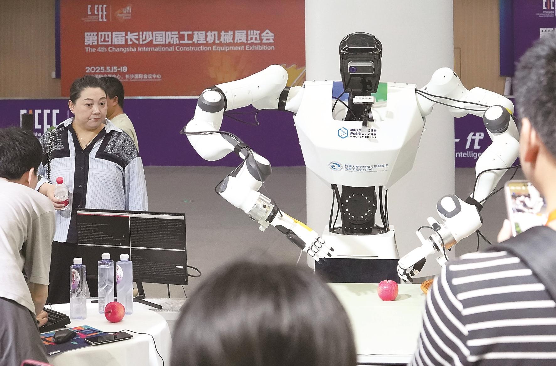 5月15日,观众在第四届长沙国际工程机械展览会现场观看人形机器人演示。