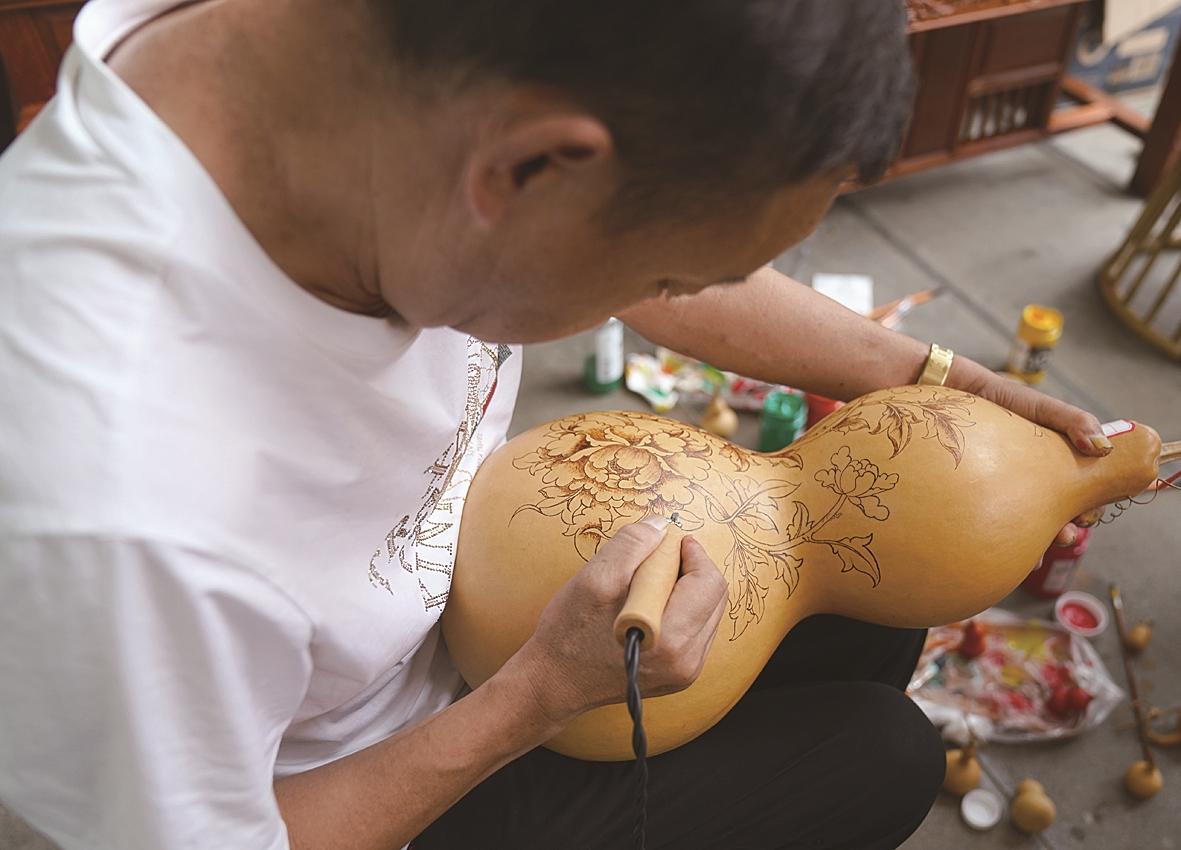 5月16日,残障人士在云南省临沧市临翔区市民活动广场残疾人创业产品展示展销现场绘制葫芦。新华社发(梁志强 摄)