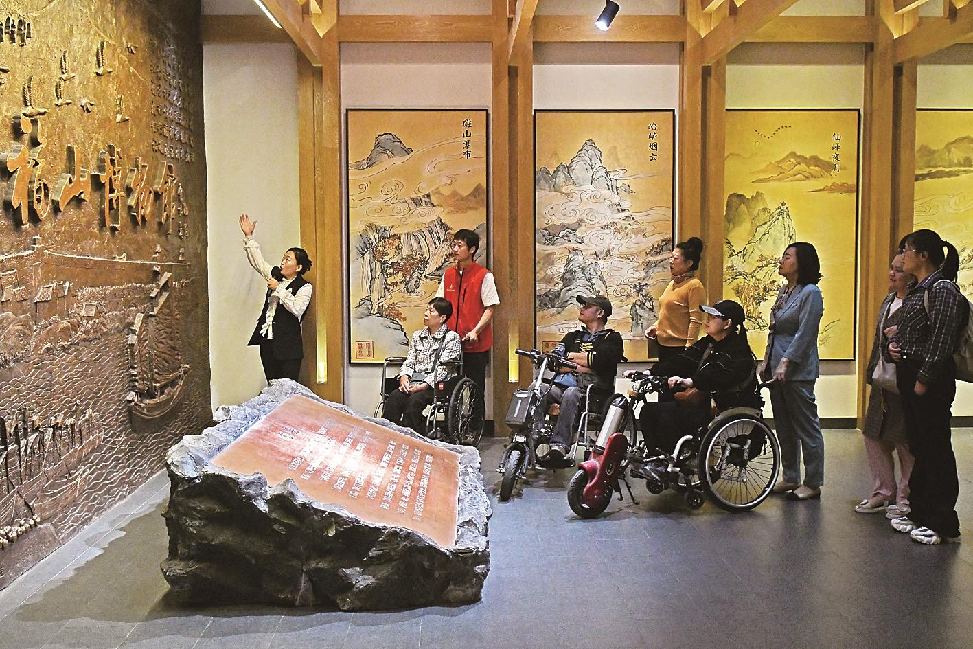 5月16日,在山东省烟台市福山博物馆,助残志愿者陪同残障人士参观。新华社发(孙文潭 摄)