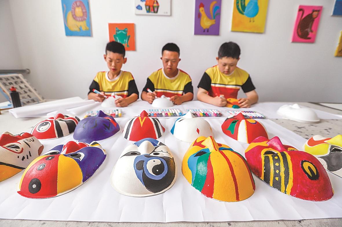 5月15日,河北省遵化市特殊教育学校的学生在美术室为脸谱着色。新华社发(刘满仓 摄)